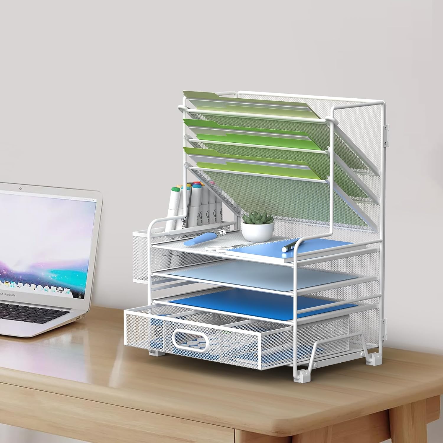 4-Tier Paper Organizer + 3-Pocket File Holder + Drawer + Pen Holders, Desktop File Organizers Paper Tray for Office Supplies School Classroom Organization (White, with Drawer & Pen Holder)