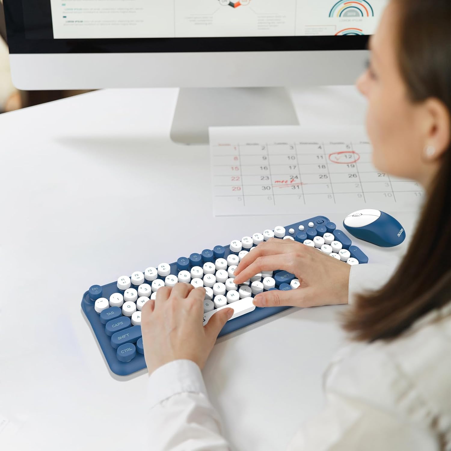 Wireless Keyboard and Mouse Combo,Retro Typewrite Keyboard and Mouse with Round Keypads,Hand-Friendly Keyboard and Mouse Wireless for Windows Laptop PC,Home Office Keyboard, White Blue