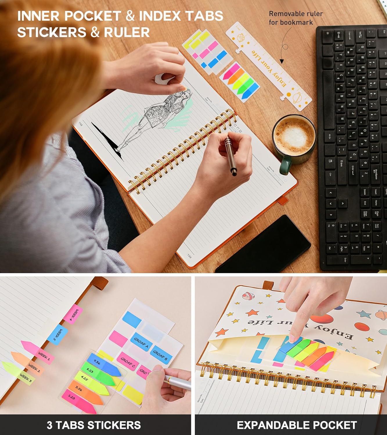 - 【Functional Accessories & Organizational Tools】This spiral journal notebook includes 1 pen holder that securely keeps your writing tool within reach, 2 elastic closure bands that protect your pages, and an inner pocket for storing small items like notes or receipts.3 index sticker tabs and one removable bookmark ruler assist in navigation.These features make it an excellent choice for school notebooks, or work notebooks, serving as a reliable spiral journal for college use.