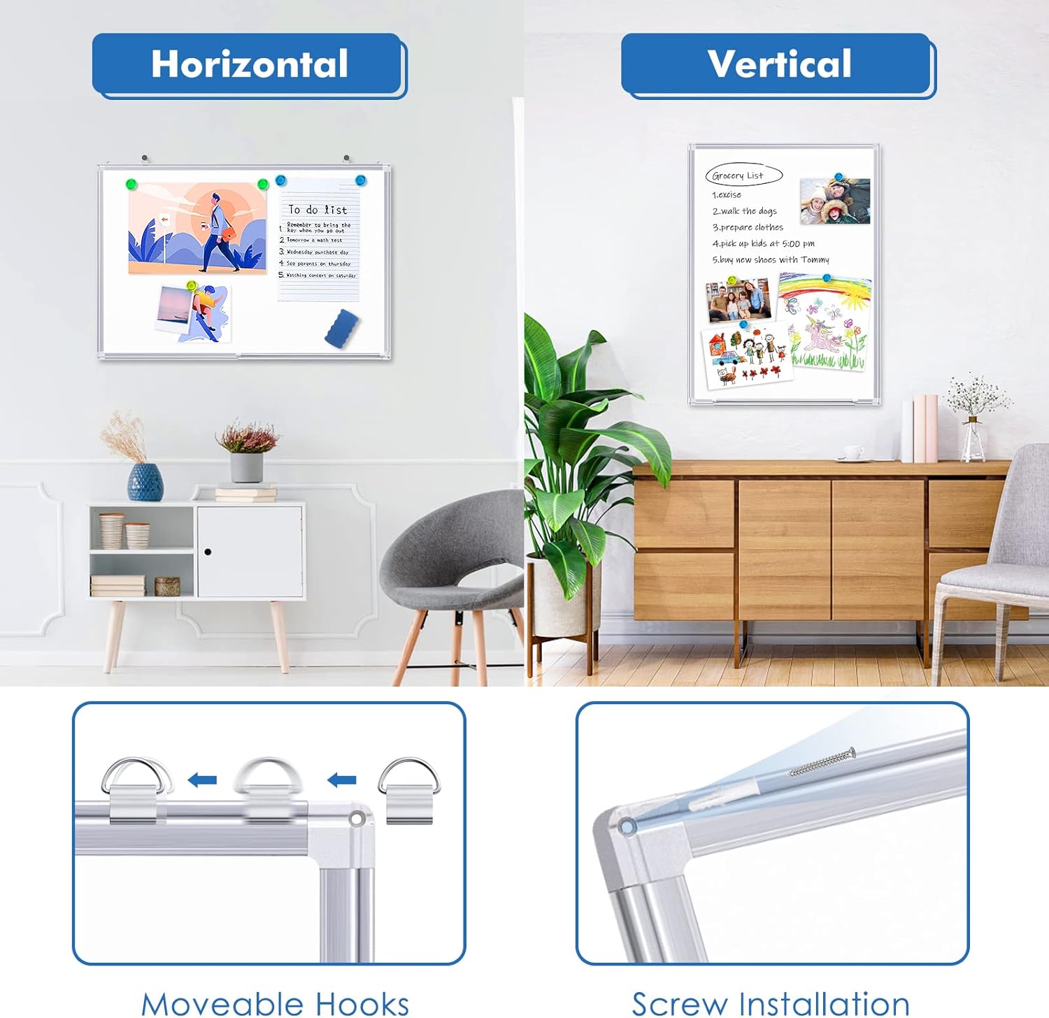 - Sturdy Construction: The magnetic whiteboard is made of silver aluminum frame and ultra-thin sheet, which makes the dry erase whiteboard lightweight and durable to withstand daily use for a long time.4 ABS rounded corners to avoid finger injuries. Please remove the protective film before use
