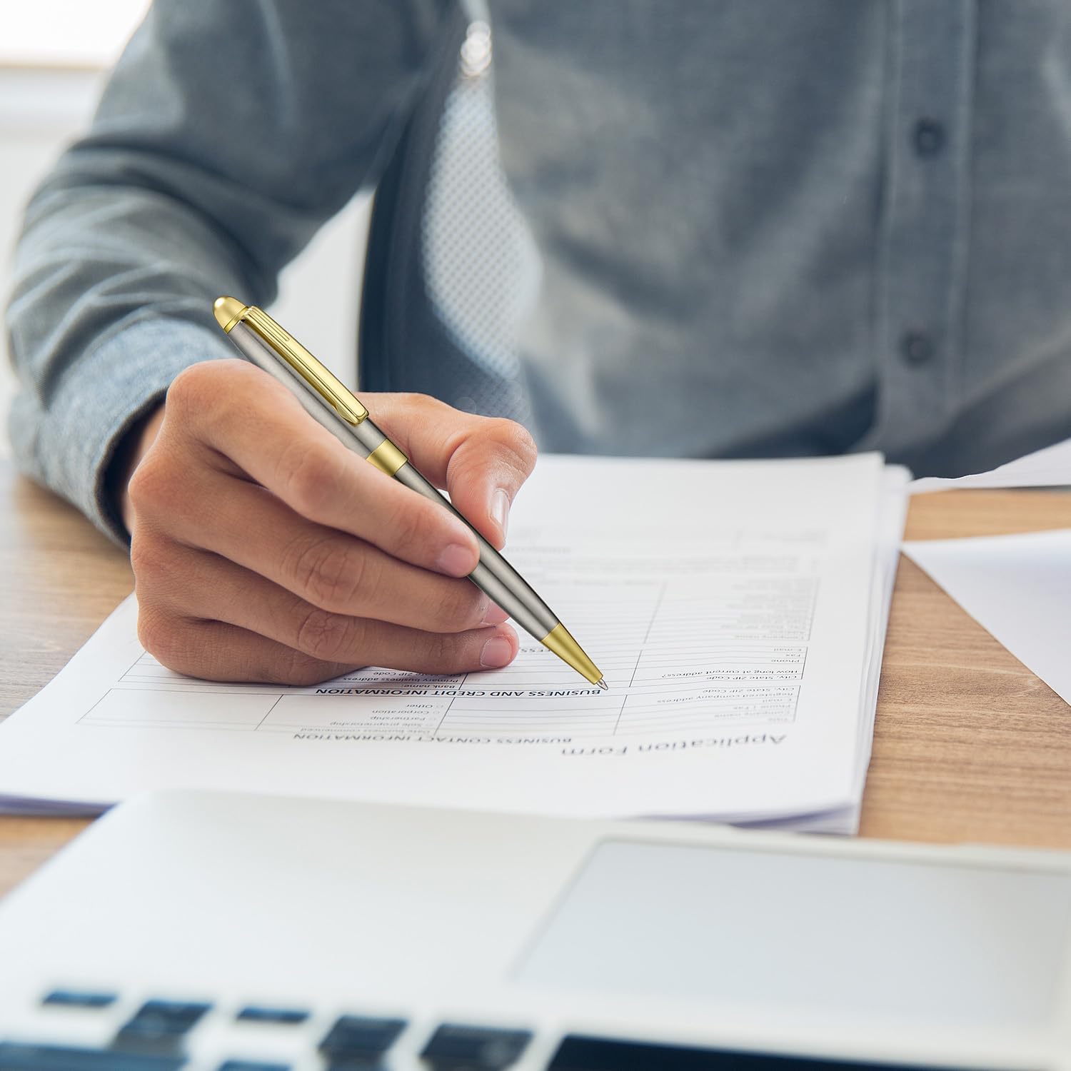 5 PCS Silver Ballpoint Pens with Extra Refills Set, 1mm Medium Point Black Ink, Great Smooth Writing Metal Pen for Business Office Teacher Student Wedding Guest Gift (Gold Trim)
