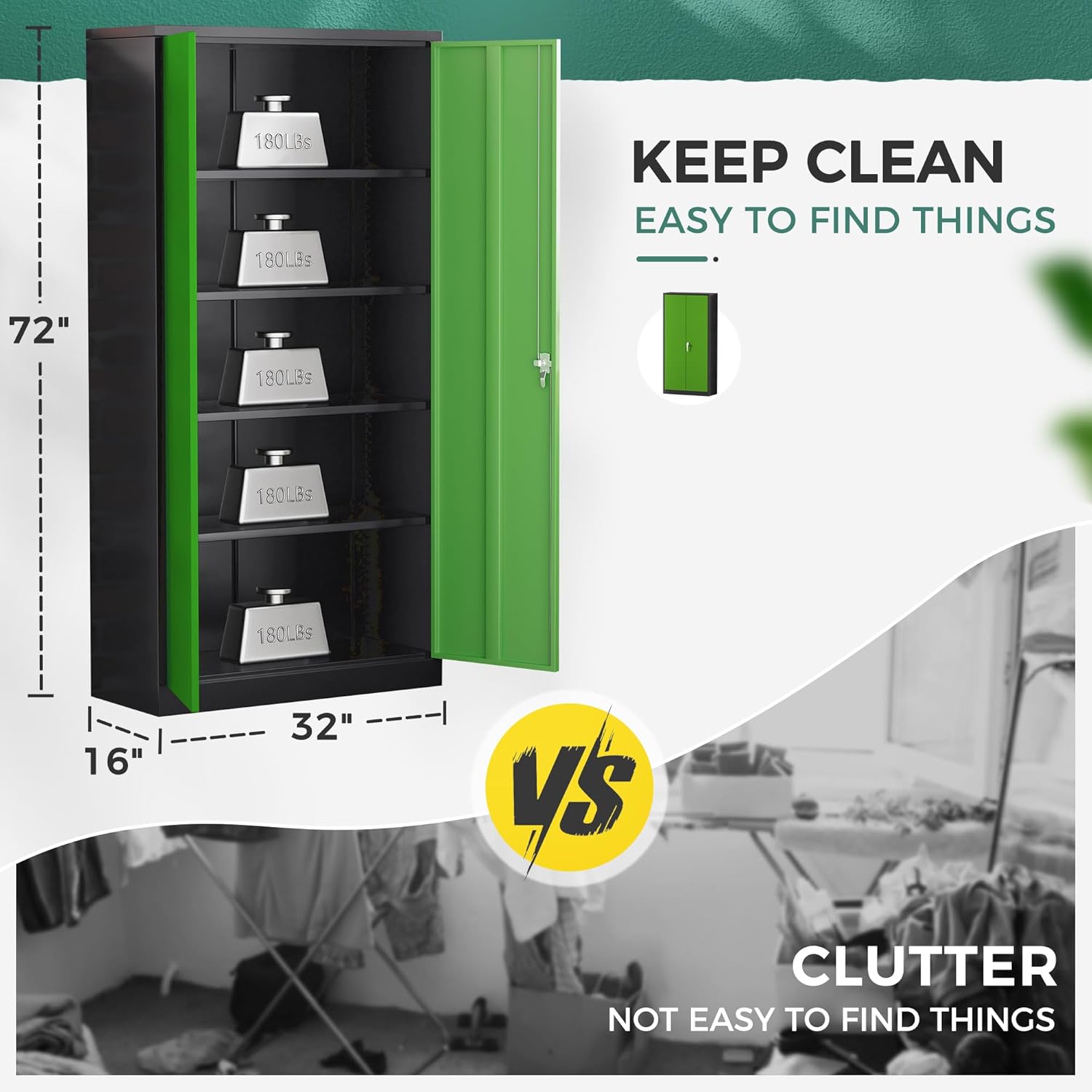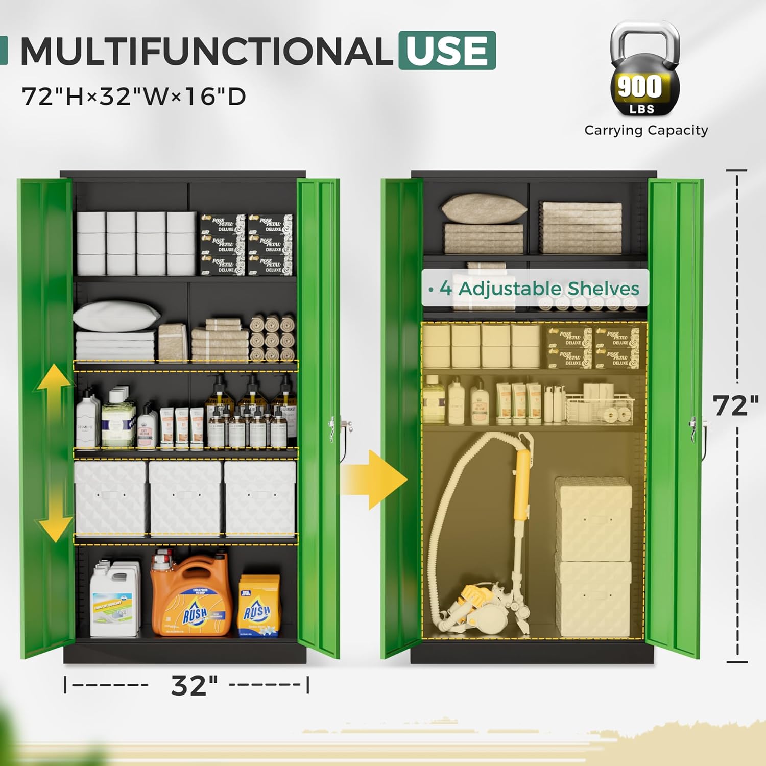 Greenvelly Metal Garage Storage Cabinet, 72" Tall Steel Storage Cabinets with Doors and Adjustable Shelves, Metal Tool Cabinets, Locking File Cabinet for Home Office, Garage, School (Black&Green)