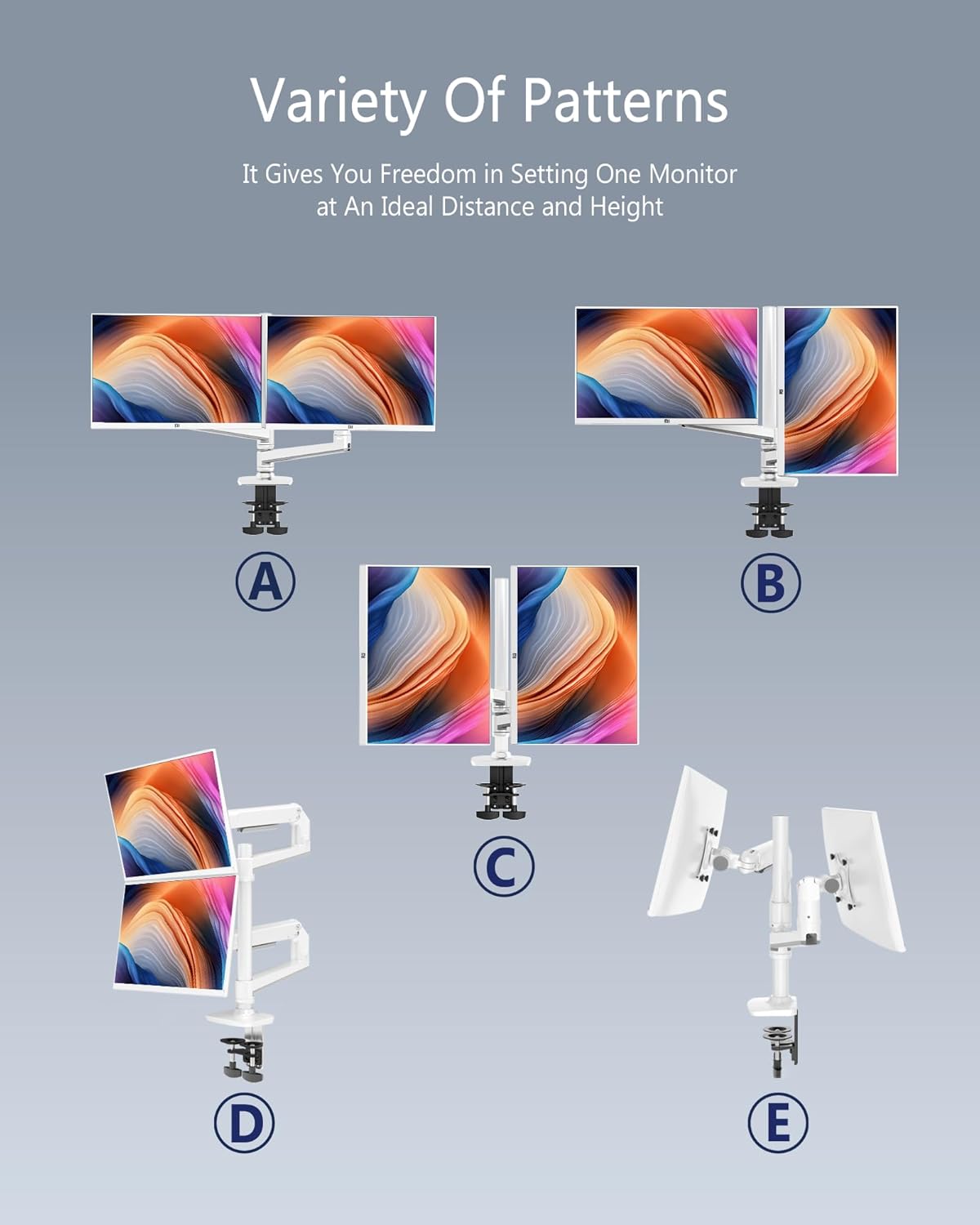 Dual Monitor Mount, Holds Screens up to 40 Inches and 25 lbs, Fully Adjustable Dual Monitor Arm with C-Clamp and Grommet Base, Aluminum, White
