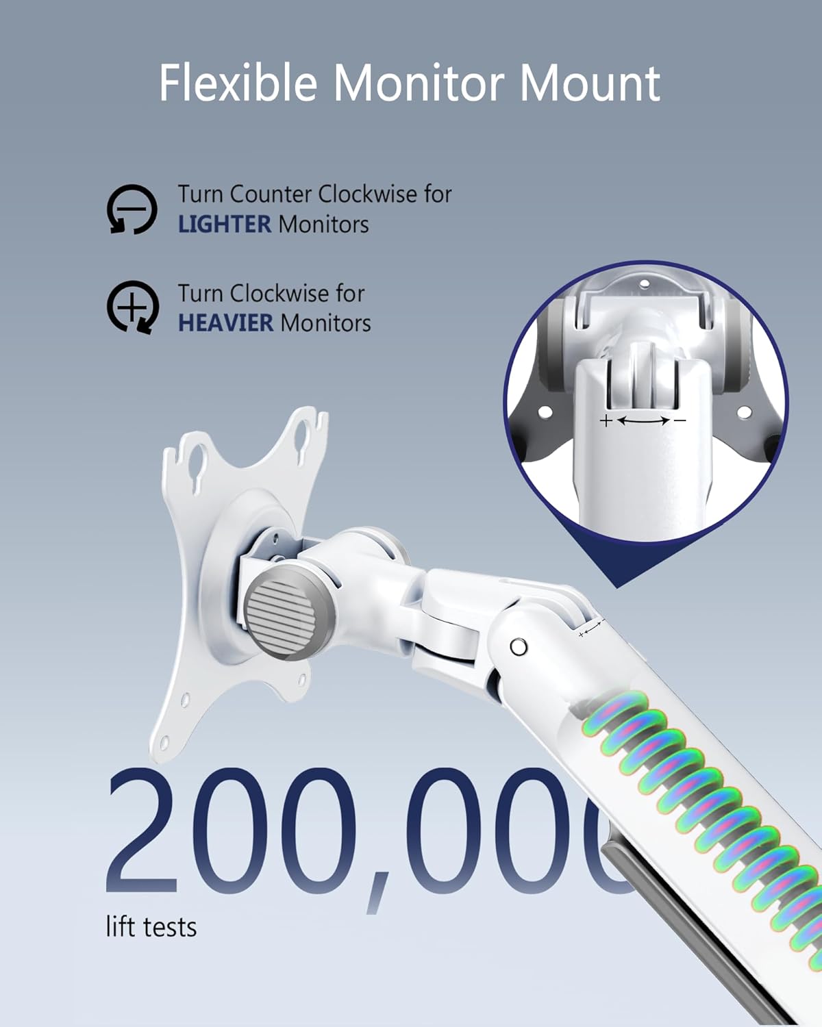 - 【Sleek Modern Aesthetic】 Stylish and elegant appearance, combined with the integrated cable management design, this white monitor arm can easily match multiple furniture styles, full of artistic beauty and comfort.