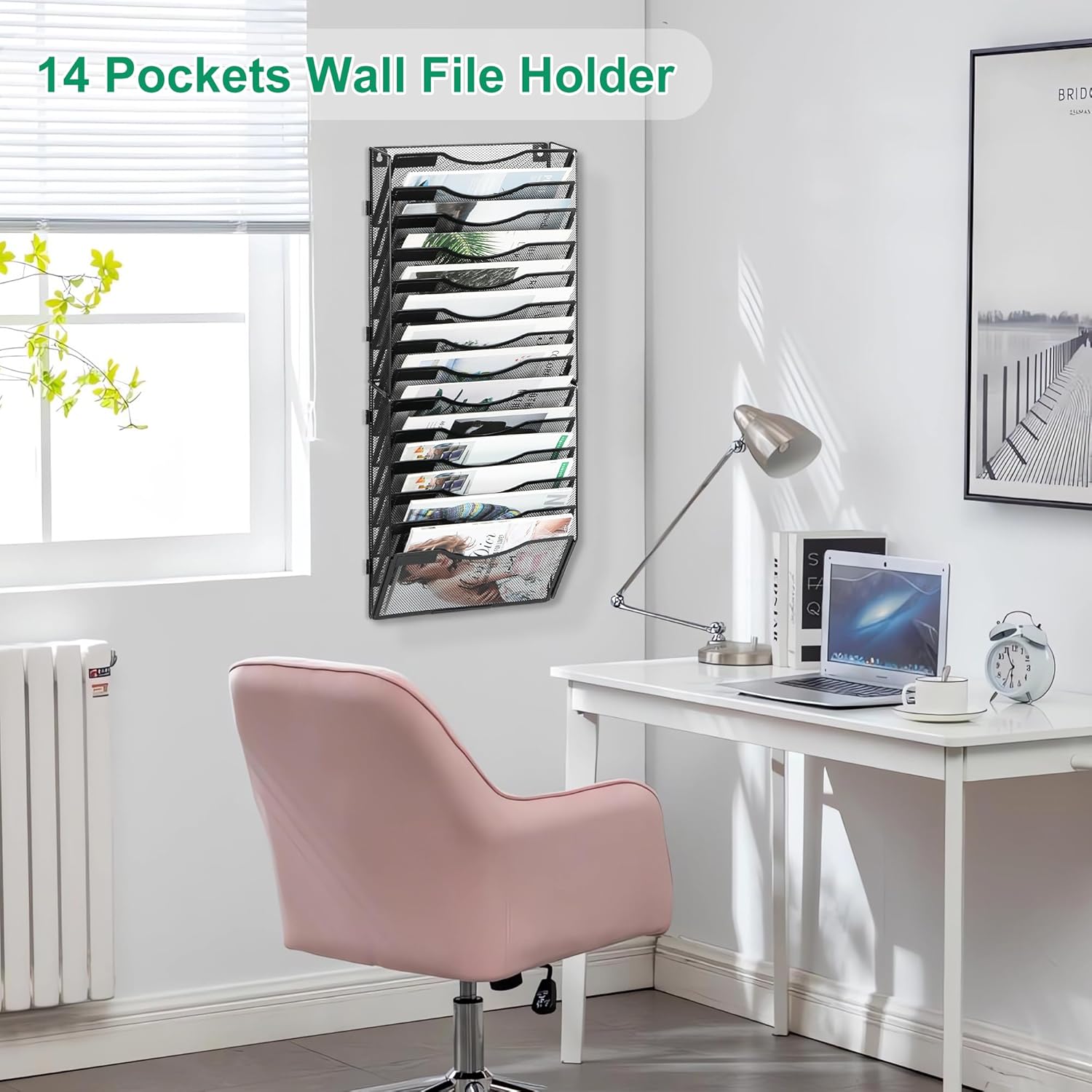 14-Pocket Wall File Organizer, Hanging Mail Organizer Wall Mounted Paper Document Holder, Metal Clipboard Storage Basket for Office Home School Organization, Black