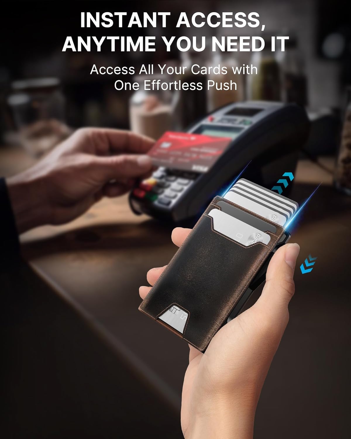 - Quick Card Access: Designed for speed, this wallet's smart pop up mechanism allows you to instantly view and select your cards. The front and back pocket provide 3 quick-release option for your frequently used card, ensuring they're always within reach.