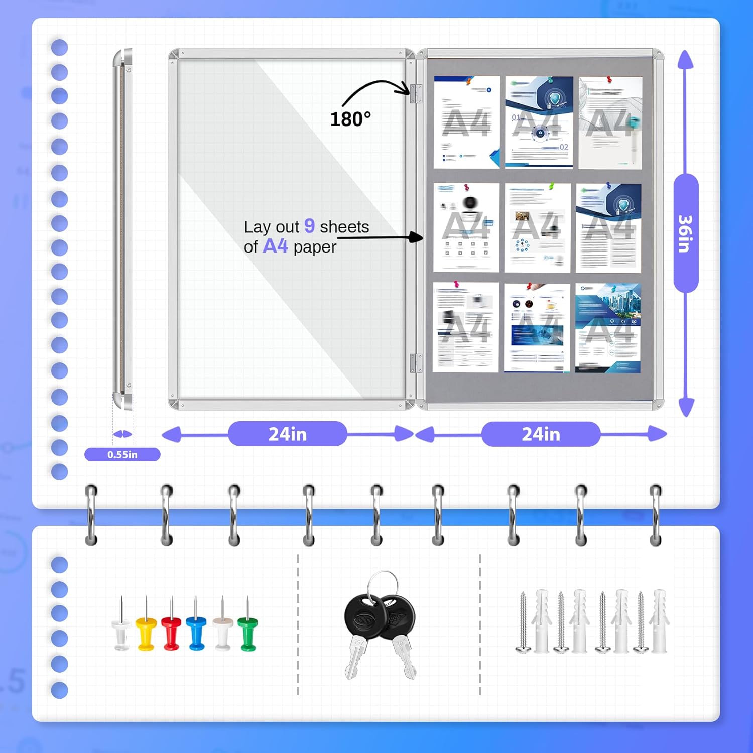 - 【ECO-FRIENDLY MATERIAL】Enclosed bulletin board made of soft, resilient, and self-healing ecological textile fibers that can withstand repeated use of pins or Velcro without distortion.
