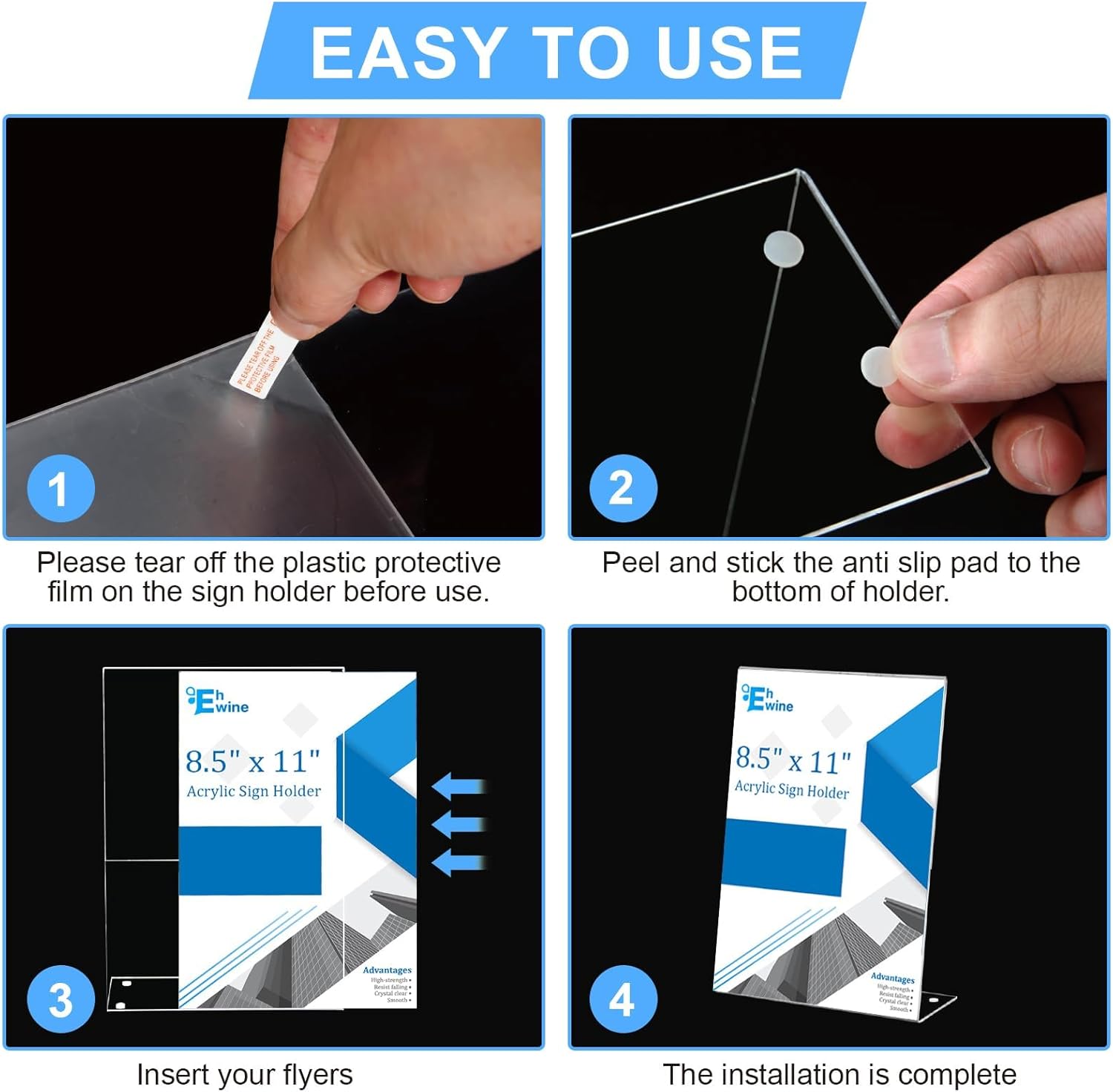 - Easy to Use: Insert 4 anti-slip pads into the base, Each of our Acrylic Sign Holder comes with a peel off film guide, follow the red arrows to peel off the film in seconds, and the plastic sign holder has an opening on its side for easy paper insertion