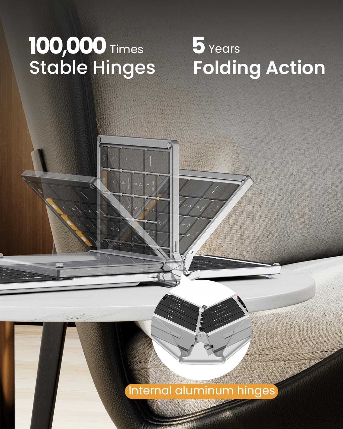 - Work Quietly Anywhere: Our foldable bluetooth keyboard features whisper-quiet scissor switches and low-profile keys, paired with a noise-reducing mouse to deliver library-level silence. Perfect for meetings, coffee shops, and flights - enhances focus by 50% without disturbing others