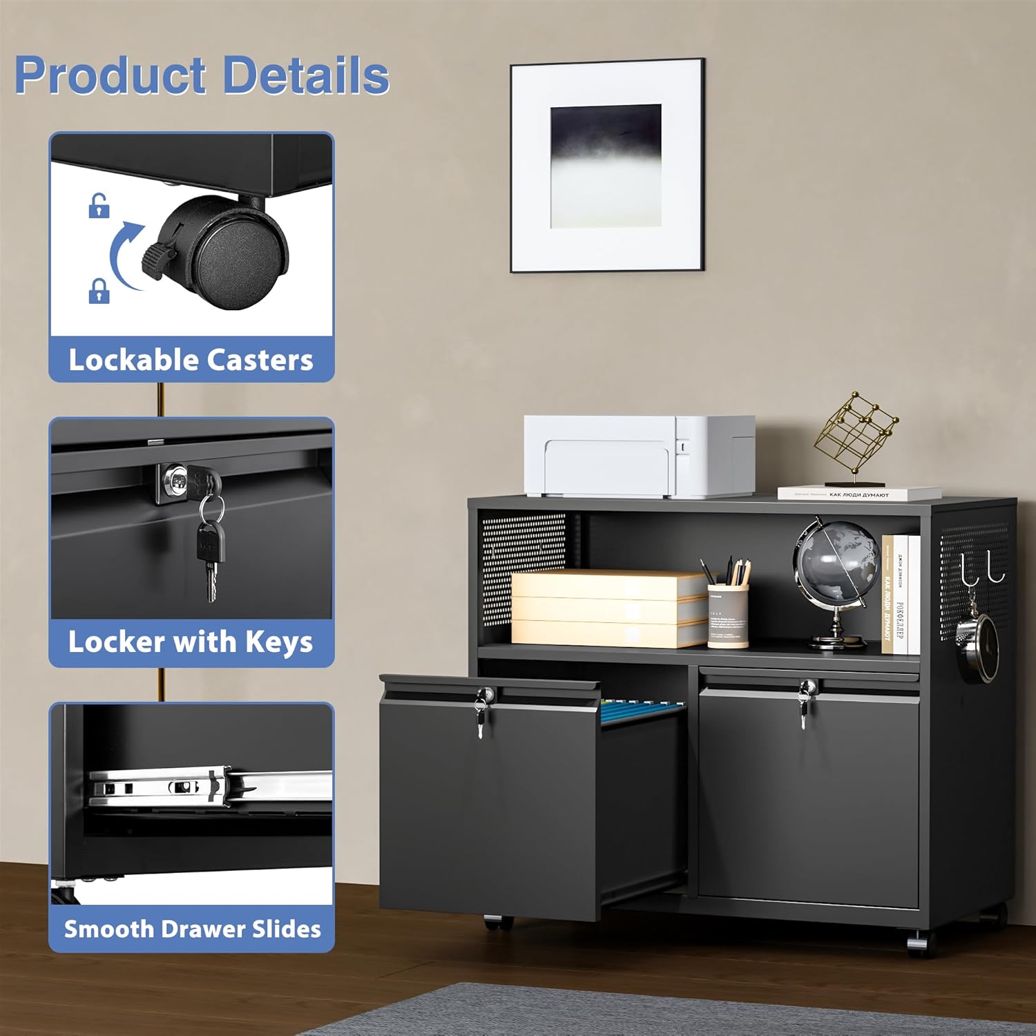 - 【Stylish Design & Easy Assemble】The storage cabinet allows hanging all kinds of accessories, and other small items. Locking file cabinet can be assembled quickly and easily,which features a convenient and uncomplicated installation.