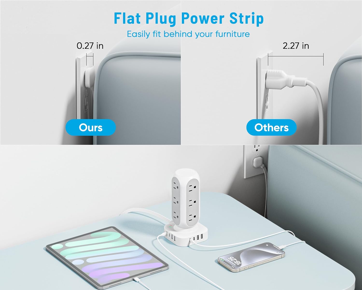 - 【20 IN 1 Power Strip Tower with USB】- This vertical power strip with USB ports features 12 AC outlets and 8 smart-charging USB ports(4 USB-C). It can charge 20 devices simultaneously without blocking, keep your desktop organized, widely use in home/office/dorm room. (Note: Please do not exceed the rated power 1875W ).