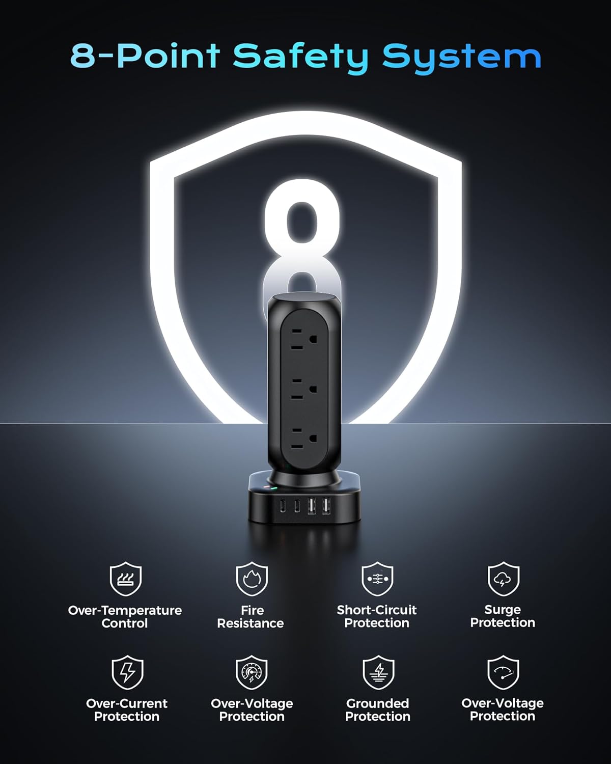 - 【20 IN 1 Power Strip Tower with USB】- This vertical power strip with USB ports features 12 AC outlets and 8 smart-charging USB ports(4 USB-C). It can charge 20 devices simultaneously without blocking, keep your desktop organized, widely use in home/office/dorm room. (Note: Please do not exceed the rated power 1875W ).