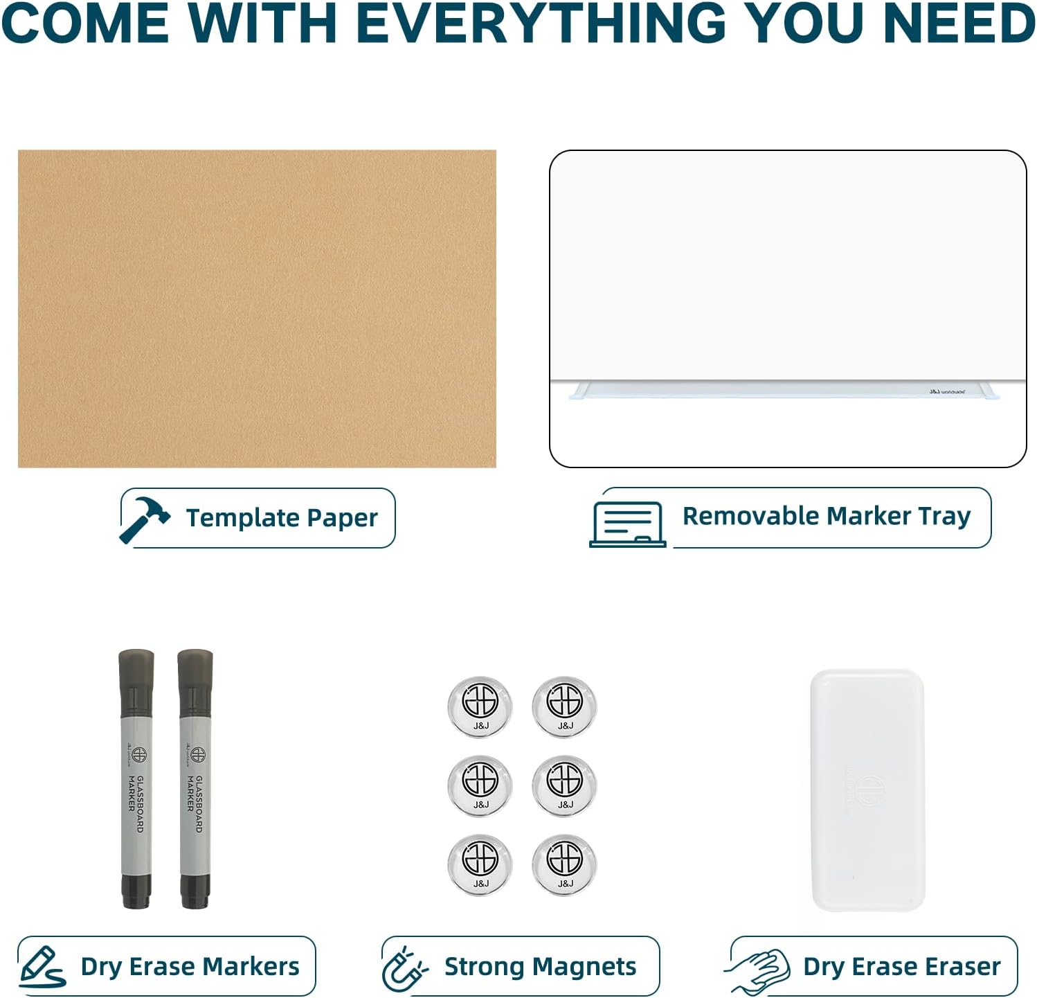 - 【ACCESSORIES INCLUDED】: The package includes 2 dry erase markers, 6 magnets, 1 glass whiteboard eraser and 1 removable aluminium marker tray for mounting. One-stop shopping. It's a great gift idea for your workmate, boss or spouse which can enhance the office/ house atmosphere