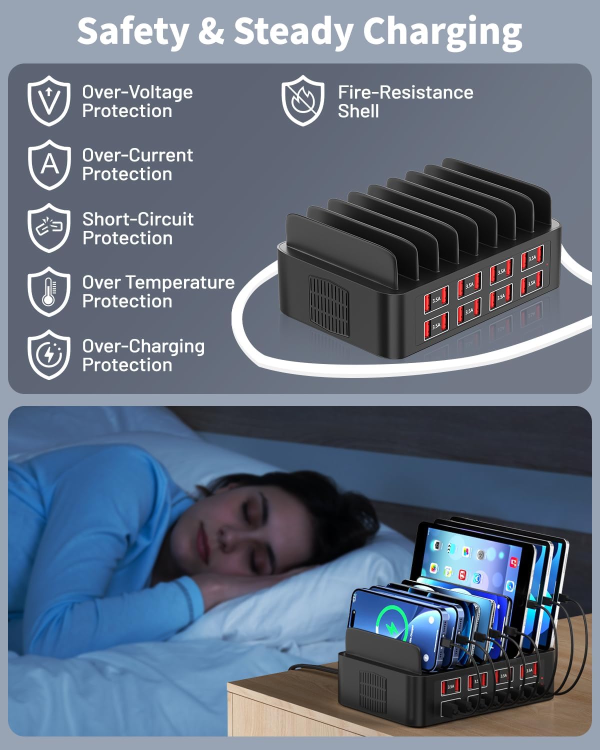 - Organized and Portable: With its compact and lightweight design, this multi charging station is ideal for home, office, and travel use. The phone charging station keeps your desk tidy and free from messy cables, making charging more organized and orderly. It easily fits into any bag, allowing you to charge your multiple devices on the go without hassle