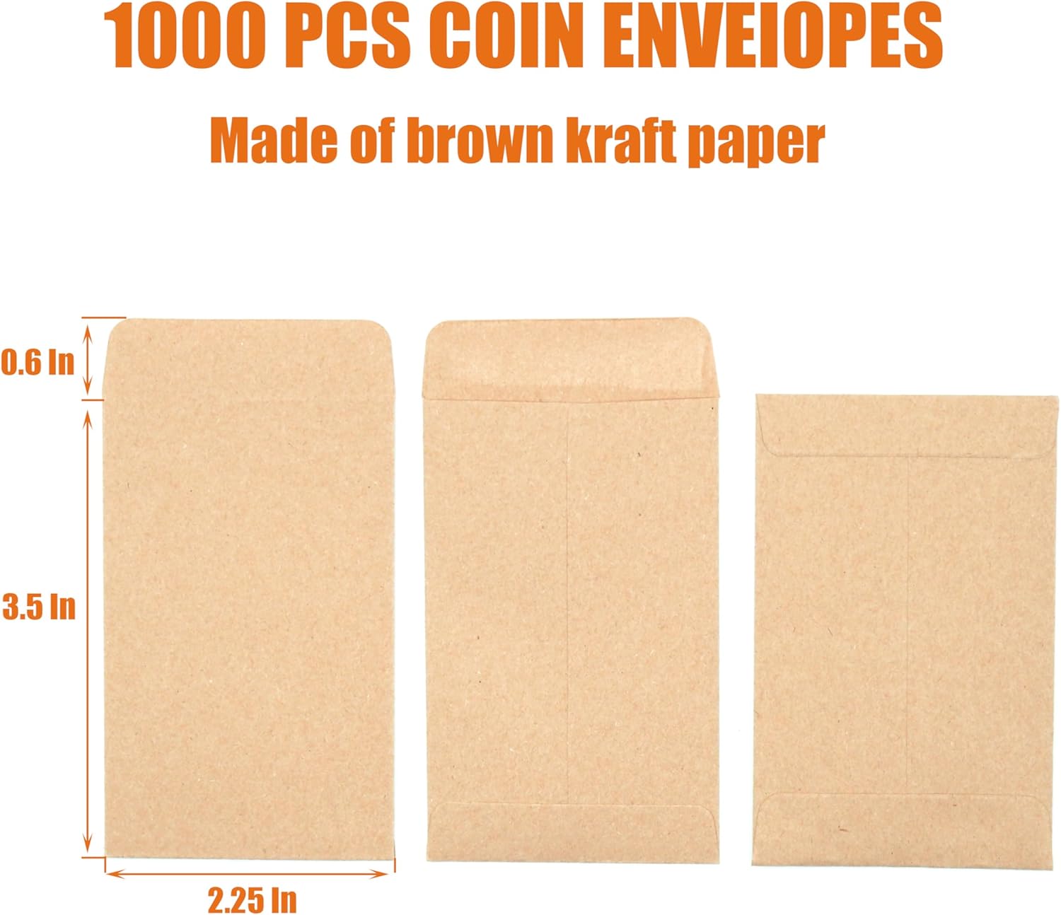 Budgenix #1 1000 Pcs Small Coin Envelopes 2.25" x 3.5" with Gummed Flap, Brown Kraft Mini Envelopes for Storing Seeds, Keys, Stamps, Tips and Small Items