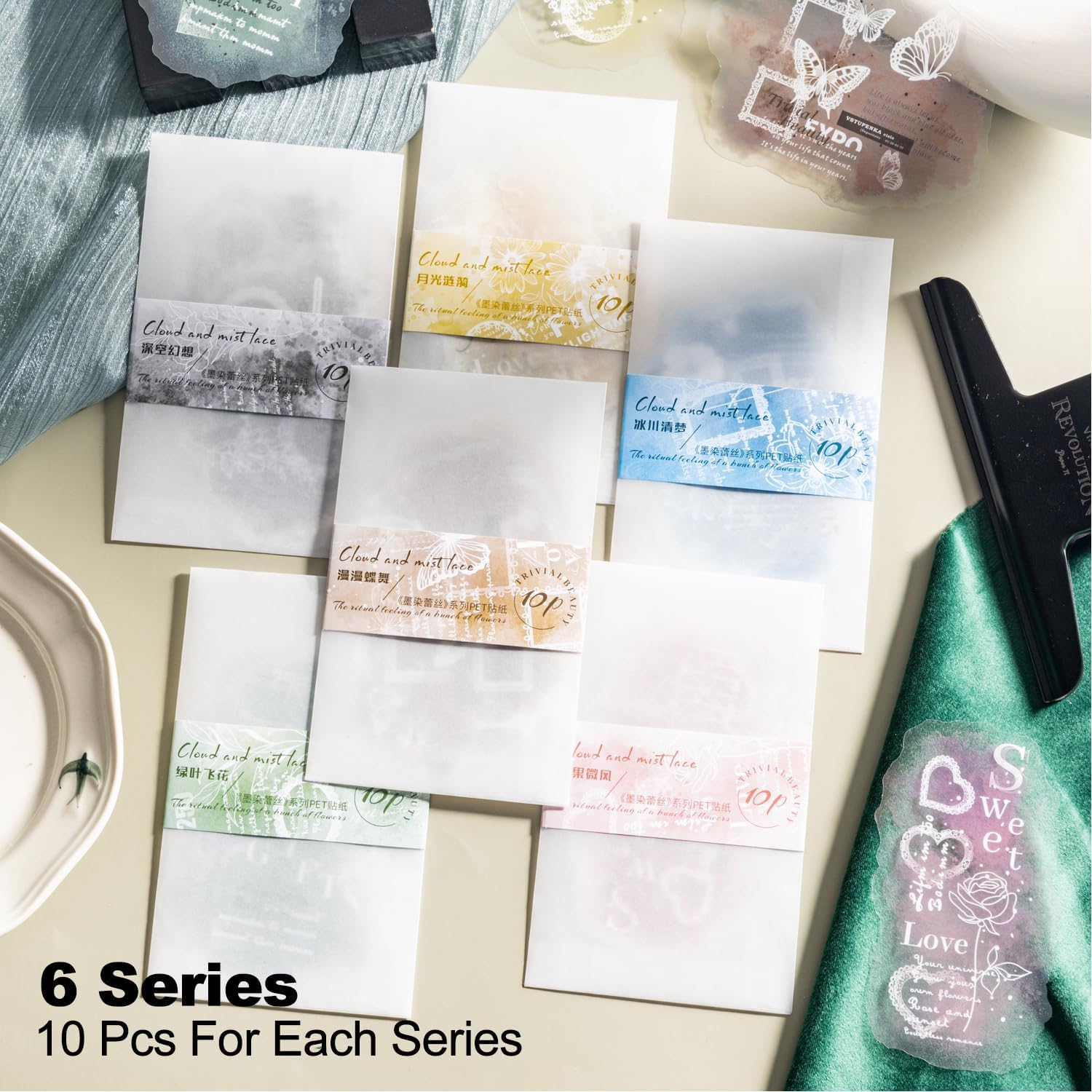- Enchanting Fantasy Designs: The "Cloudr and Mist Lace" sticker set features 60 captivating PET stickers, each illustrating mesmerizing fantasy themes such as Deep Space Fantasy, Glacier Dreams, Candy Breeze, Butterfly Dance, Moonlight Ripples, and Green Leaf Blossoms. Perfect for enhancing journals, scrapbooks, and creative projects with a touch of ethereal beauty.