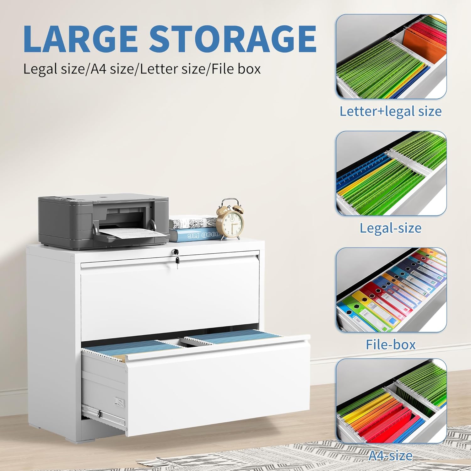 - ăSturdy and Functională The 2 drawer file cabinet size:D15.75"*W35.43"*H28.5", drawer size:D13.98"*W32.44"*H9.8", each drawer can support up to 55 lbs. The lateral file cabinet is equipped with premium full-extension metal drawer slides, allowing for smooth and easy access even when fully loaded, making organization a breeze.