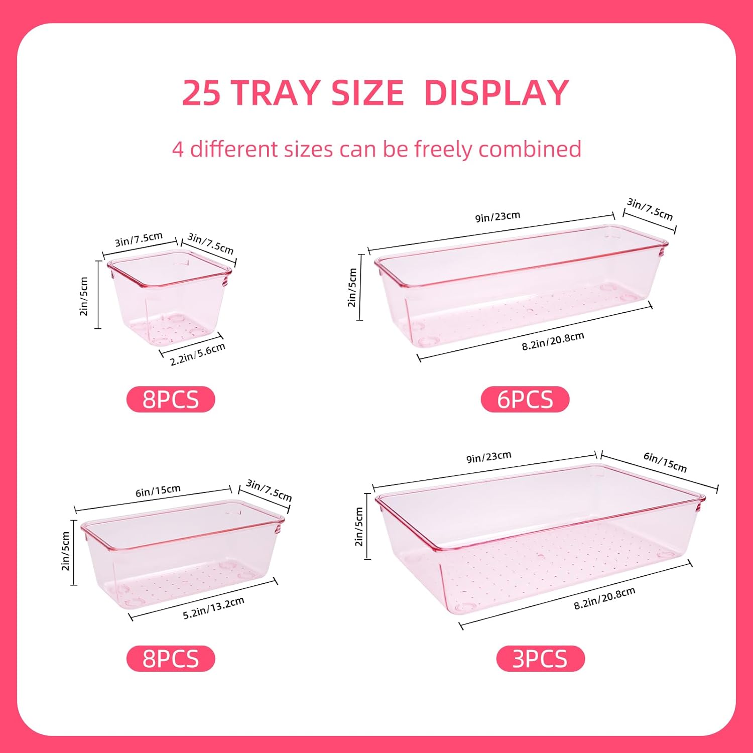 - 【4 SIZE PINK MAKEUP DRAWER ORGANIZER TRAYS】 Total 25 PCS: 9 x 6 x 2 inches (3 pcs), 9 x 3x 2 inches (6 pcs), 6 x 3 x 2 inches (8 pcs), 3 x 3 x 2 inches (8 pcs), help you customize the combination to store items and organize drawers on shelves.