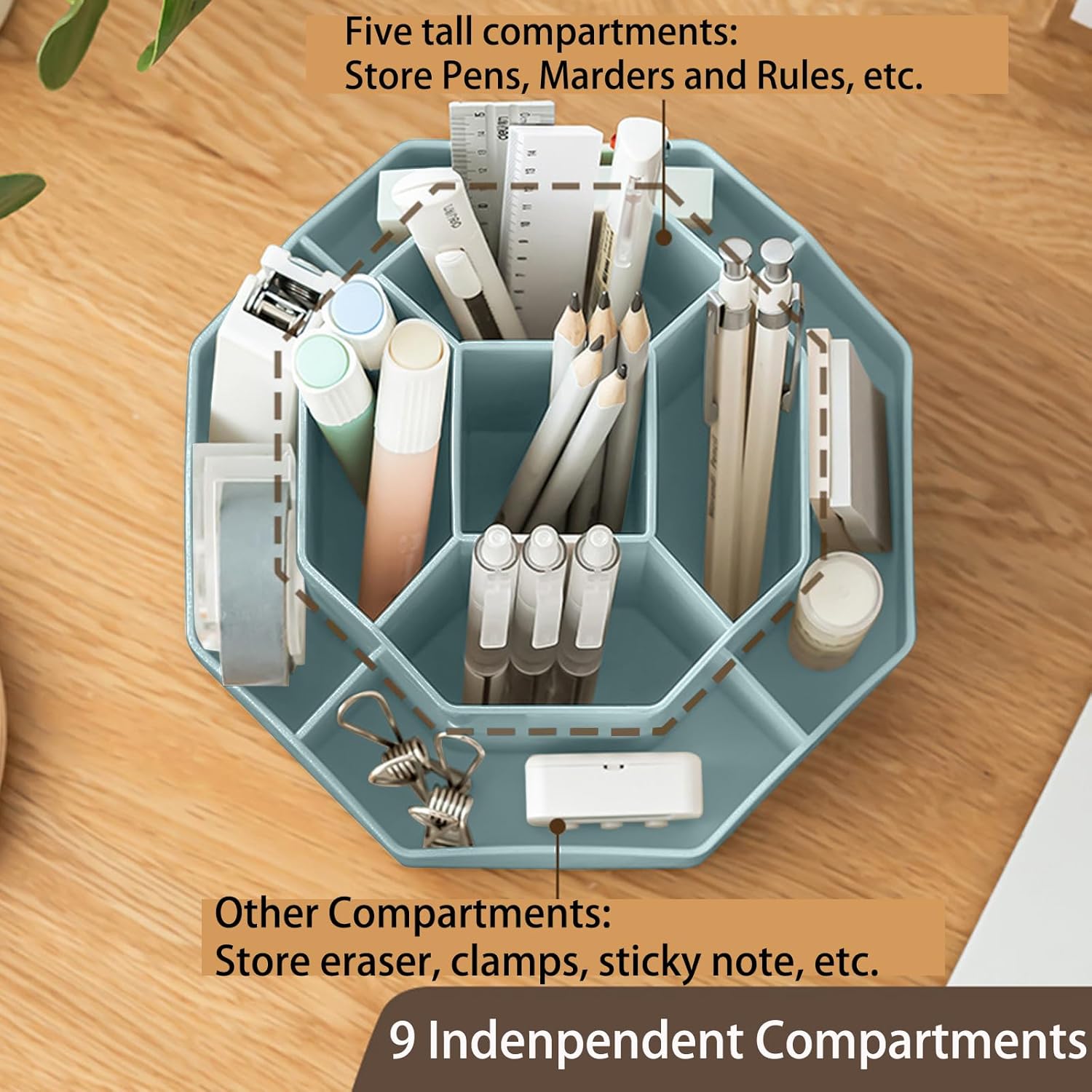 - 【9 Independent Compartments Design】This pencil organizer has 9 divided compartments with different spaces and heights to meet your needs, makes it easy to hold and sort pencils, pens, rulers, scissors, pencil knife, etc. Save your time searching for different pens.