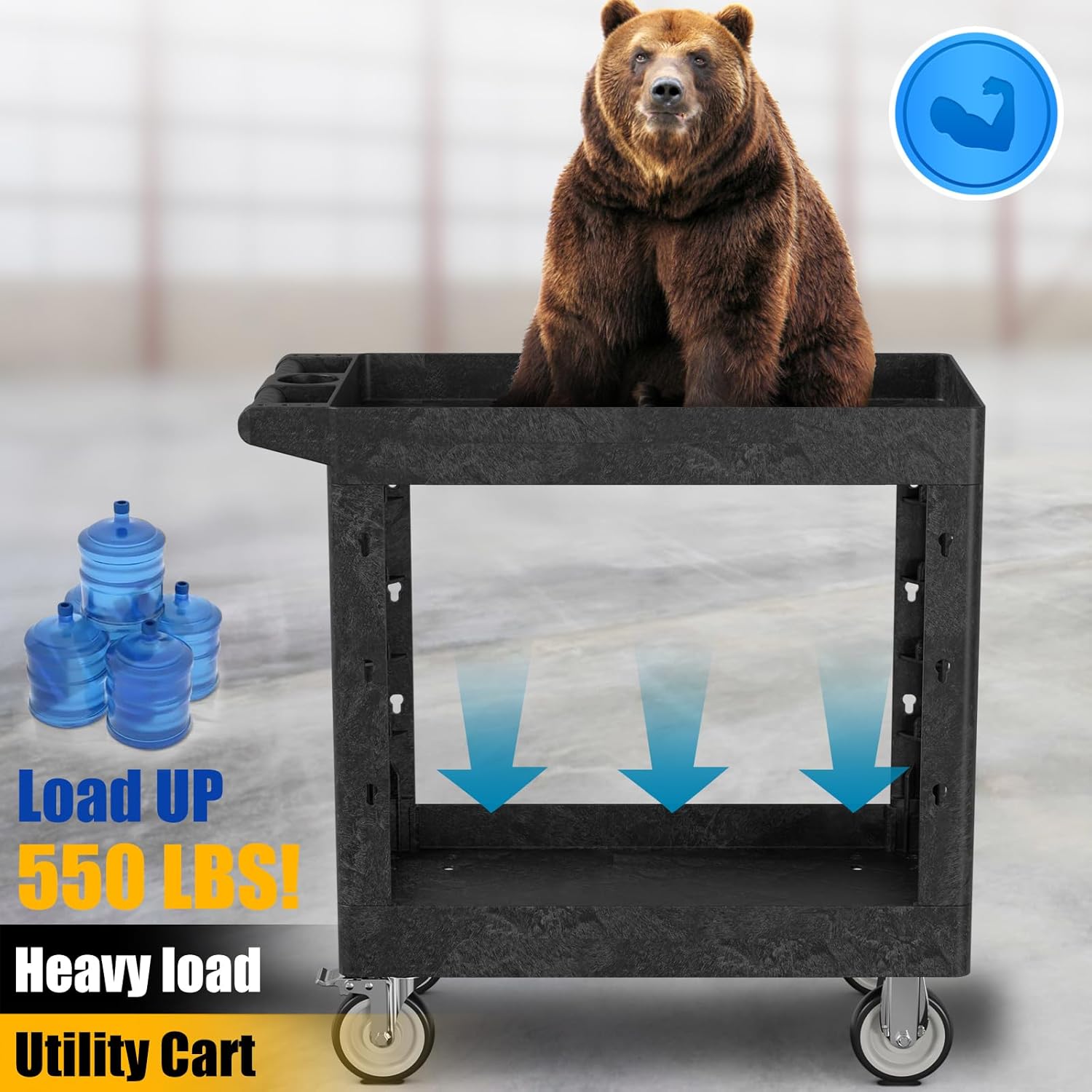 Service Utility Plastic Tool Cart, 34 x 17-Inch Rolling With Deep 2-Shelf, Heavy Duty Wheels, 550 lbs Capacity Organizer for Garage, Warehouse, Workshop