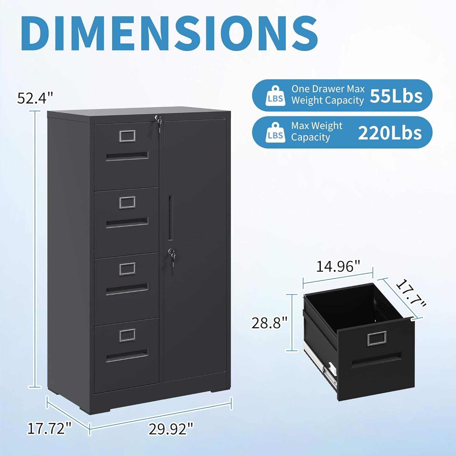 - 【Sturdy and Long-lasting Construction】The 4 drawer locking file cabinet is made of high-quality cold-rolled steel, ensuring it's strong and long-lasting. Each drawer can hold up to 55lbs, you can sit a printer on the top of the metal cabinet without worry, making it perfect for busy offices.