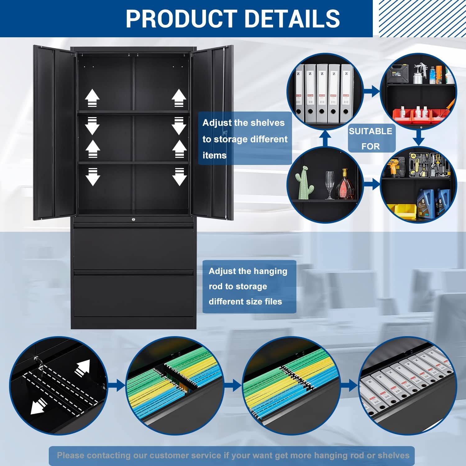 - UNIQUE DESIGN - An independent metal cabinet on top of the whole cabinet is equipped with a adjustable metal shelves. By adjusting the distance between the partitions, items of different sizes can be stored in this metal cabinet; Underneath the whole cabinet is a metal drawer equipped with metal hanging rods. By adjusting the distance between metal hanging rods, you can store documents of different sizes here.