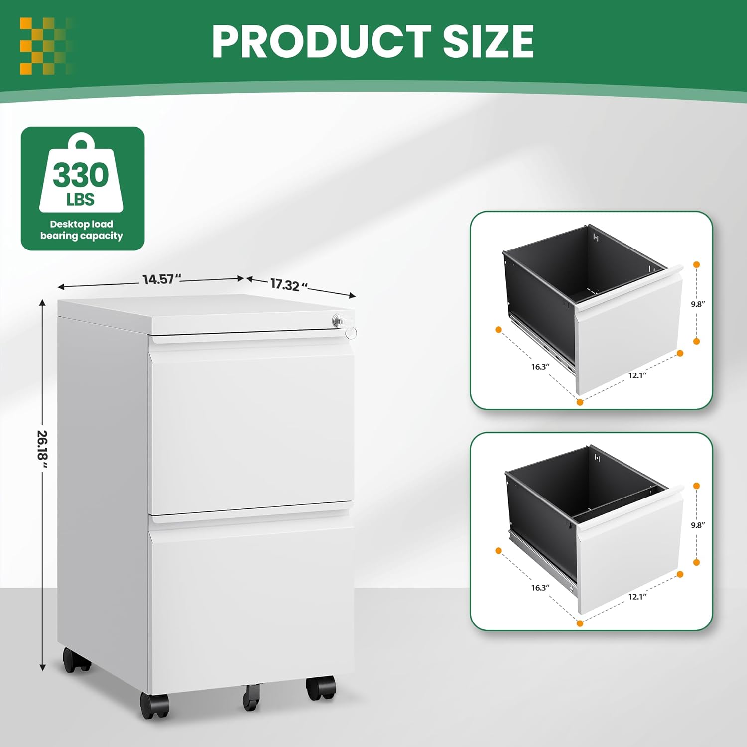 Mobile File Cabinet with Lock, 2 Drawer Under Desk Filing Cabinet with Wheels for Legal/Letter/A4 (Fully Assembled,White)