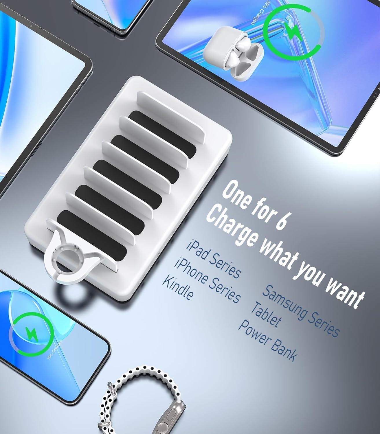 - ăWide compatibilityăThe charging station for apple devices is compatible with 1000+ usb devices.Whether you are in school, office, bedroom, desk or bedside table, it can easily charge all your electronic devices at the same time. It is also a perfect gift for family and friends