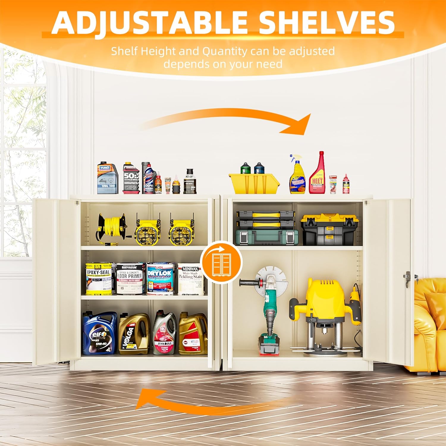 - 『EASY TO ASSEMBLING』42 inch×36 inch×18 inch (H x W x D). 2 wing doors with a 180°opening angle. The garage storage cabinets is knock-down structure. The package comes with detailed assembly instructions, easy to assemble.