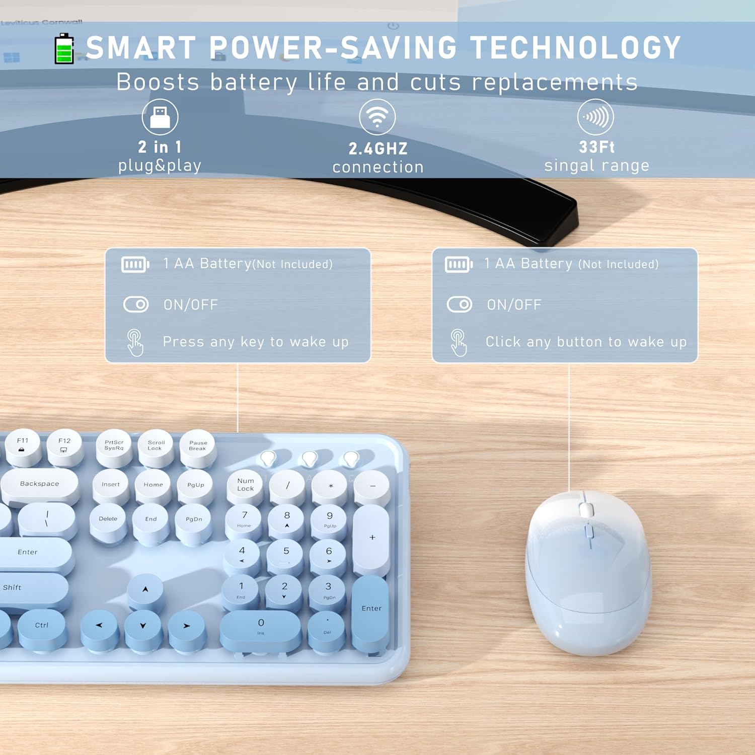 Wireless Keyboard and Mouse, Full-Size Retro Typewriter Keyboard with Round Keycaps, 2.4GHz for Windows, Mac, Laptop, PC, Desktop (Blue Gradient)