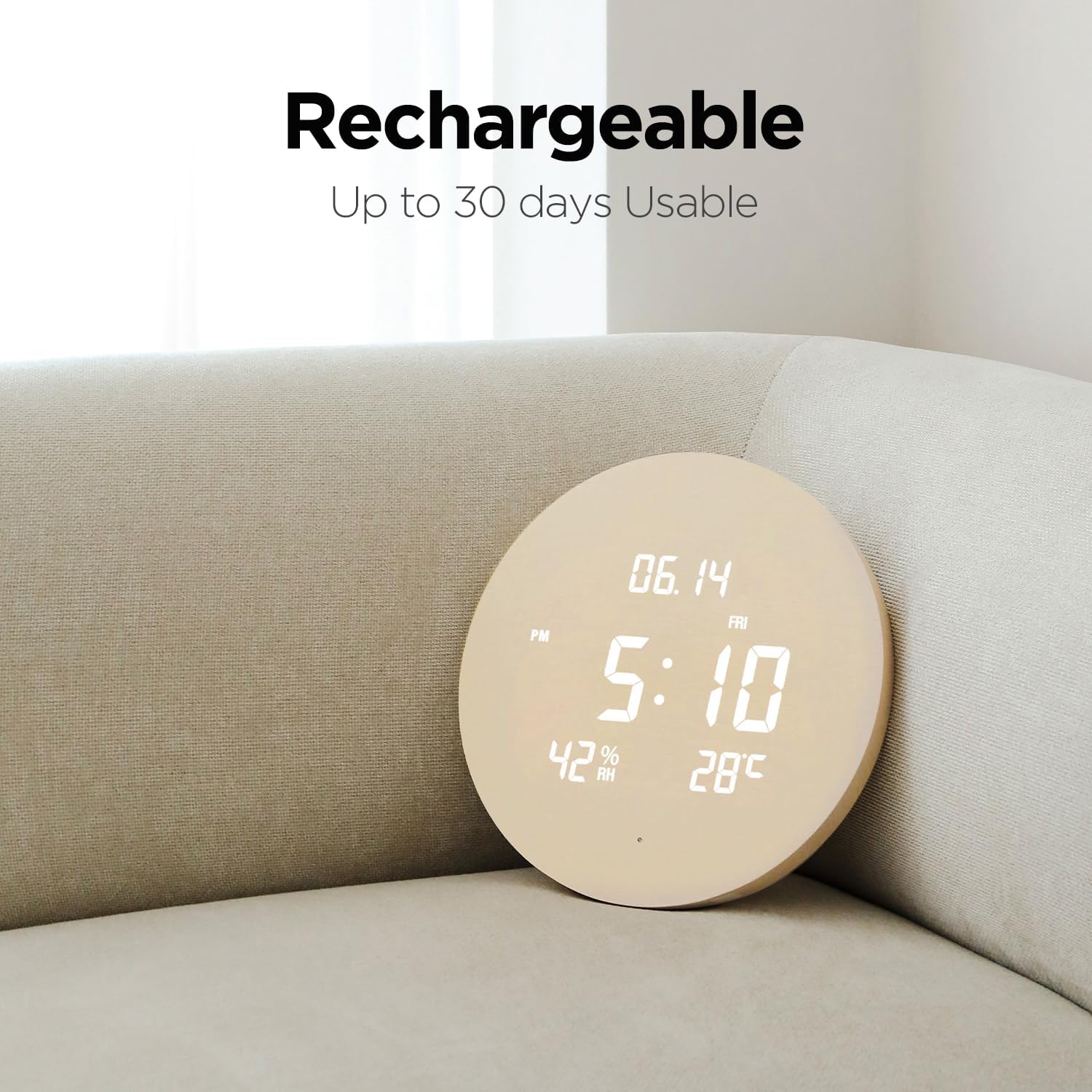 - Rechargeable: Powered by a 16,000mAh battery, this wireless LED clock can last up to 30 days on a single 15-16 hour USB-C charge. The built-in battery indicator ensures you're always aware of the charge status.