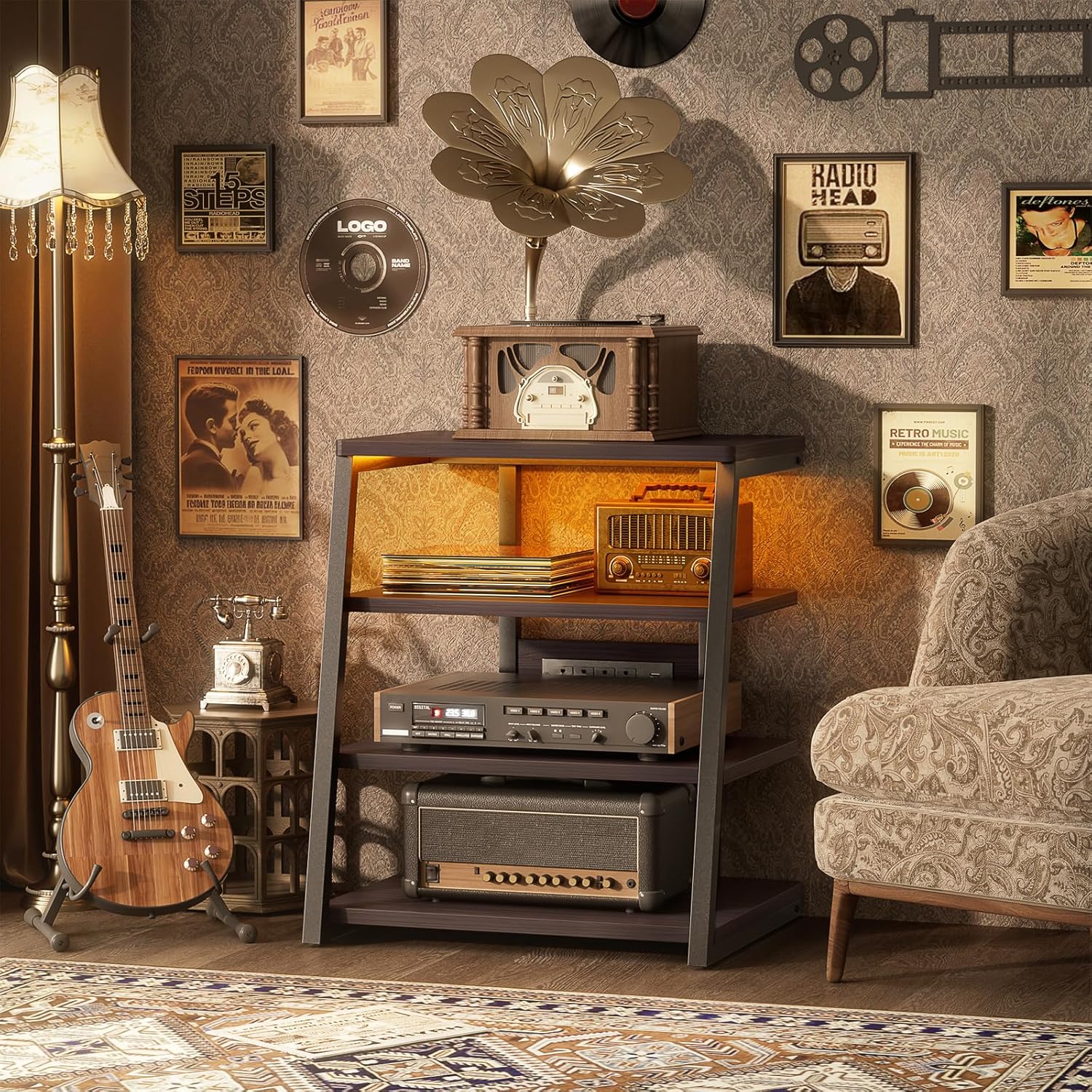 - [ Compact and Space Saver ] The small audio component rack is compact but has plenty of room for the sound system. This audio rack will help to hold your stereo components well and not mess up at all because of the built-in power strip and velcro tape. You will get a classic and neat room.