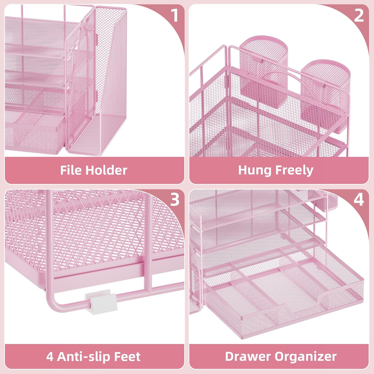 Marbrasse Desk Organizer and Accessories,4-Tier Paper Letter Tray Organizer with File Holder, Workspace Desk Organizers Accessories with Drawer and 2 Pen Holder (Pink, 15.4" x 9.1" x 8.3")
