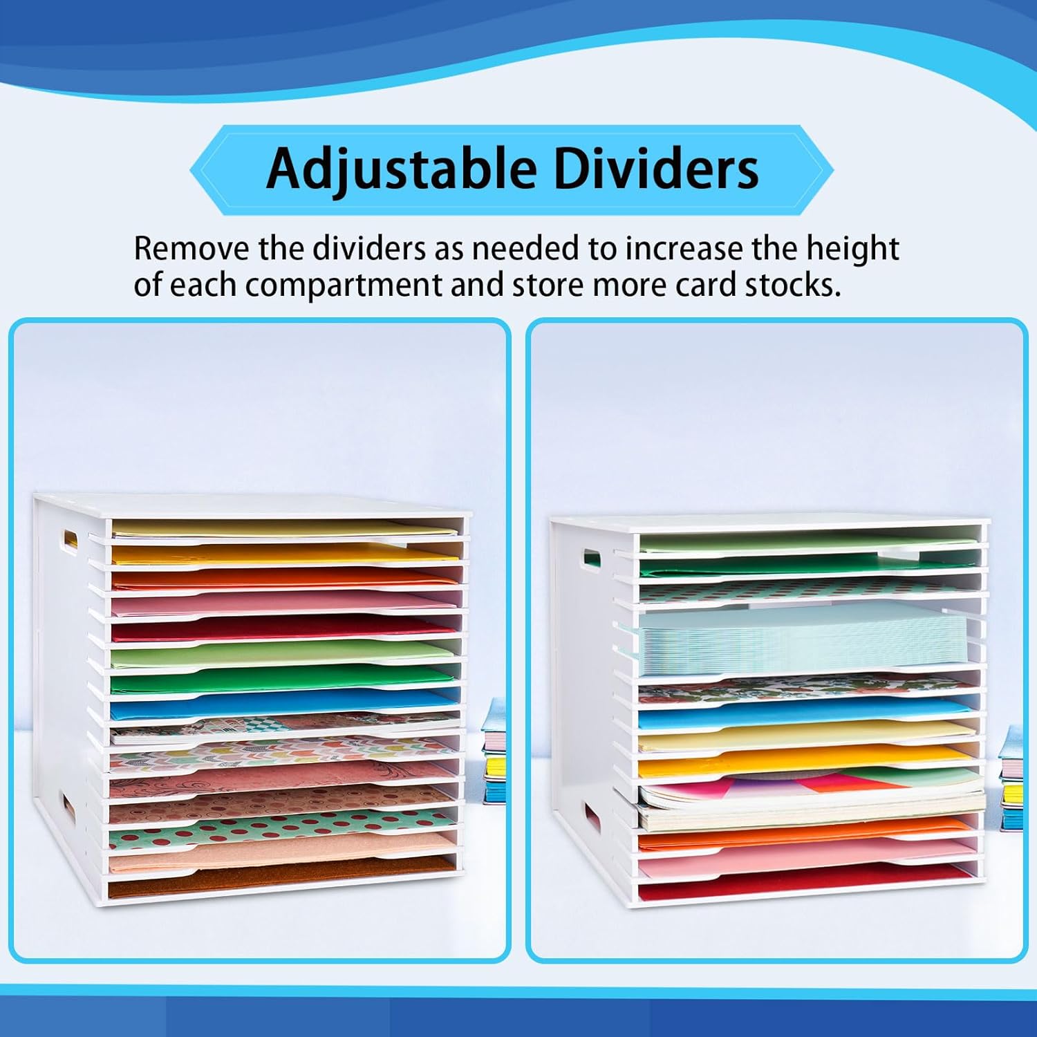 - Adjustable Layer Heights - The scrapbook paper rack has adjustable dividers, allowing you to adjust the height of each layer to accommodate different crafting materials and supplies. Tailor your storage to your needs and enjoy the flexibility our rack offers for your creative projects
