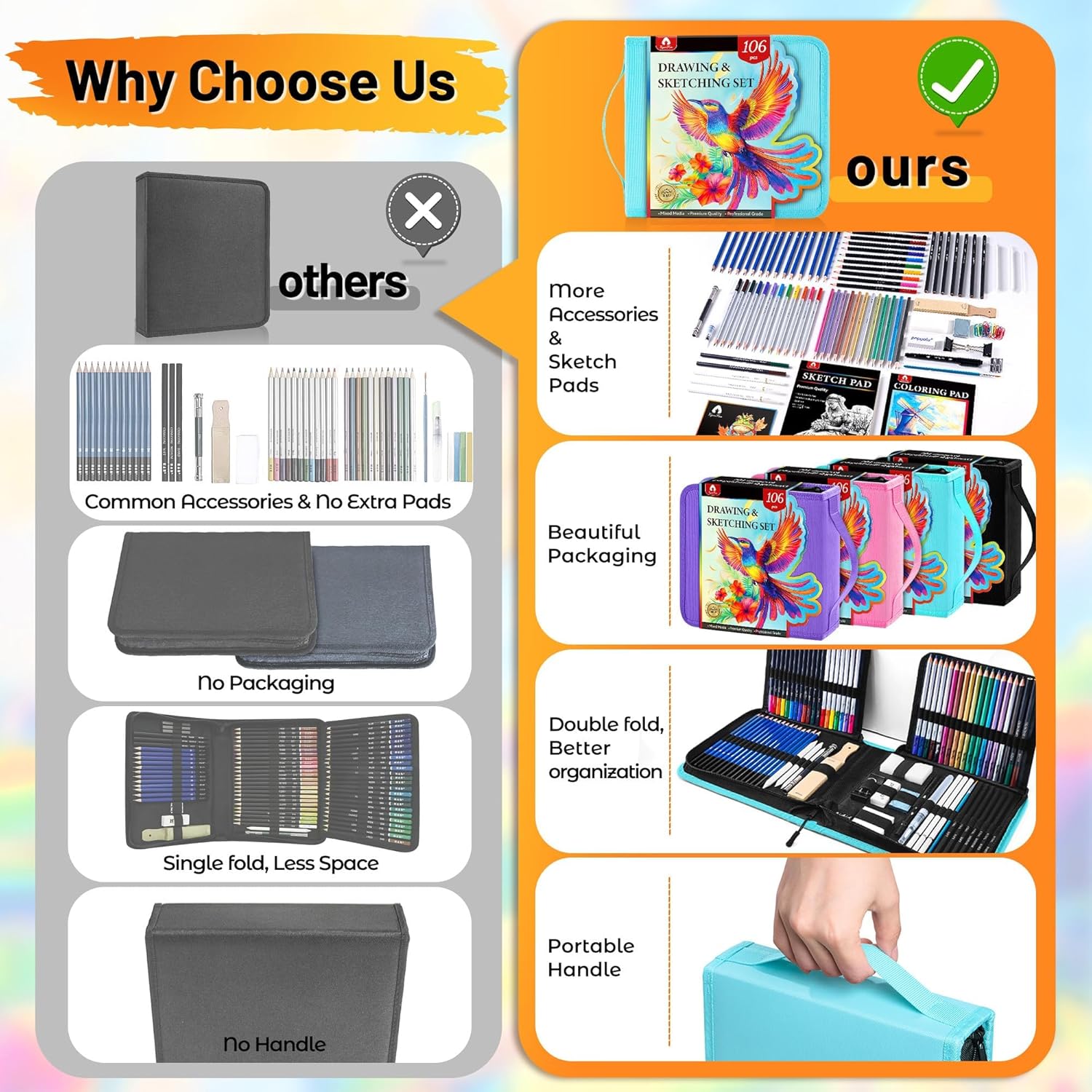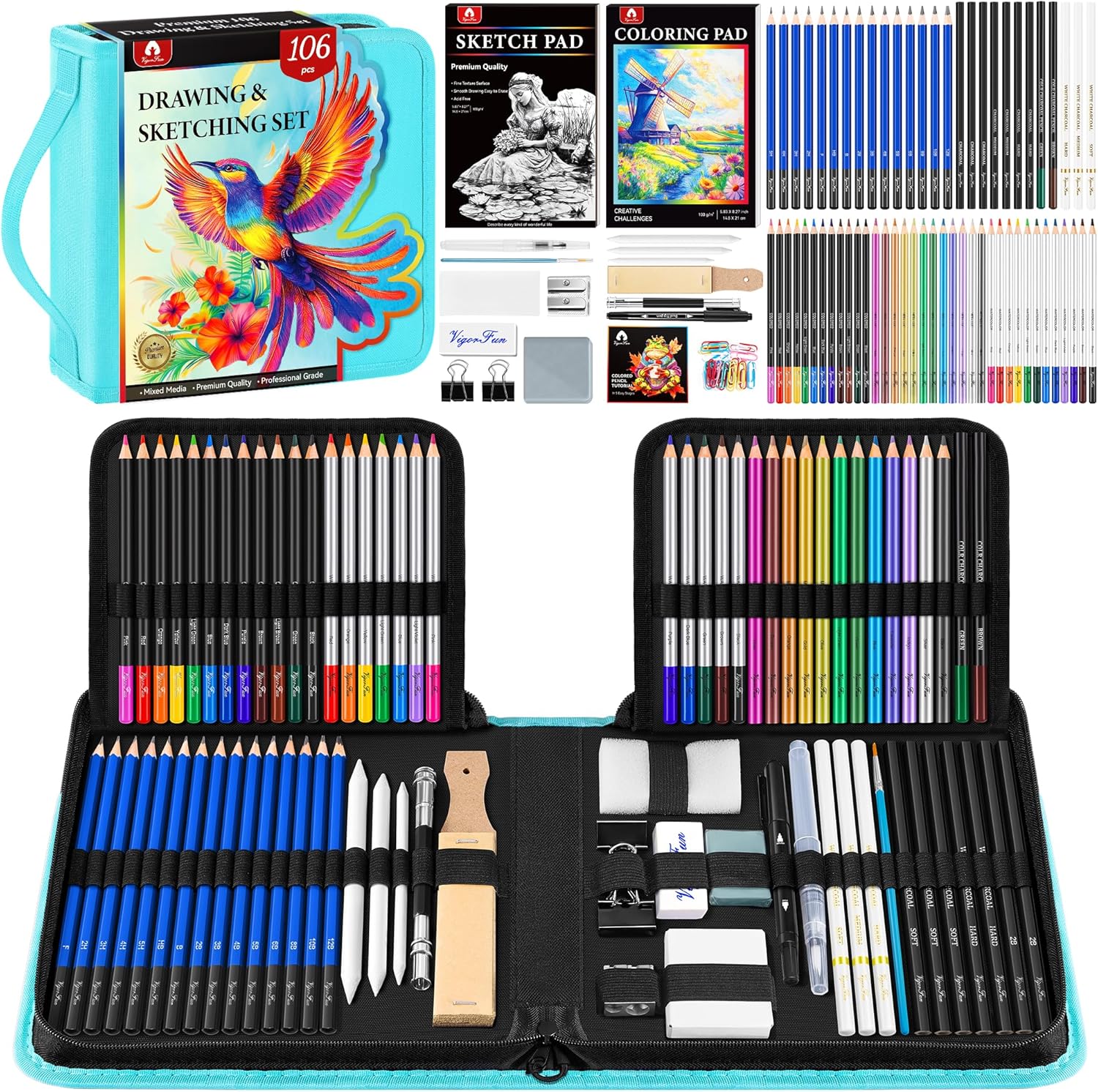 106 PCS Art Supplies Sketching Kit, Pro Drawing Pencils with 3-Color Sketchbook, Coloring Book, Colored Graphite Charcoal Watercolor & Metallic Pencils, Drawing Supplies Gifts for Artists Adults Kids