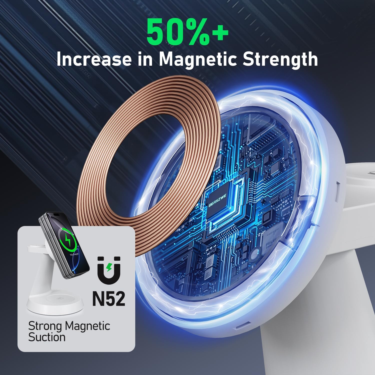 - 3 in 1 Magnetic Wireless Charger Station: BERXZWE 3 in 1 magnetic wireless charger station has newly upgraded magnetic suction. Efficiently wireless charging of iPhones, Apple Watches, and AirPods. The portable charging station means you no longer have to search for multiple chargers or deal with a cluttered desktop.Bring you a fast and stable magnetic wireless charging experience