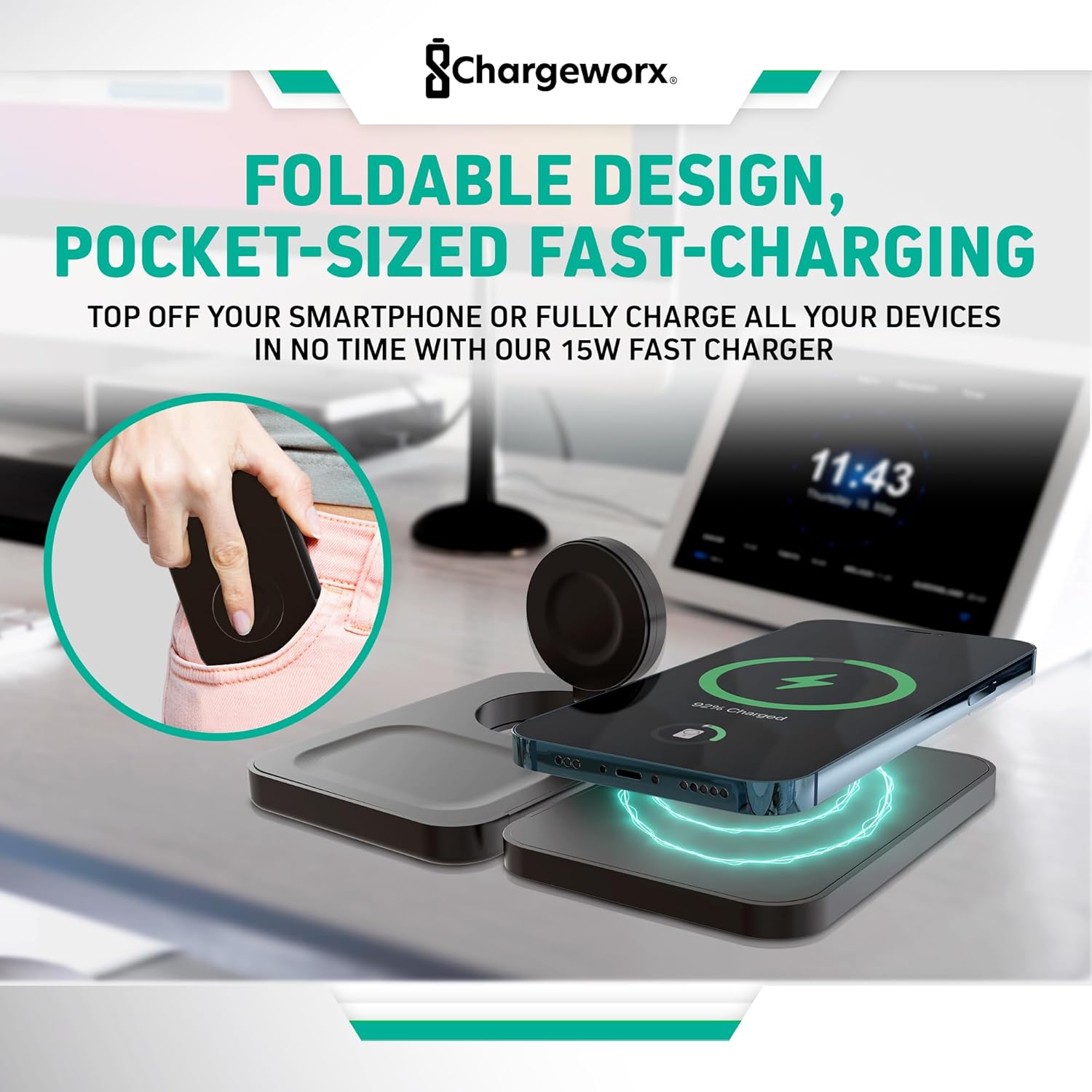 CHARGEWORX 3-in-1 Wireless Charger, Foldable Magnetic Charging Station with 15-Watt Fast Charging, Compatible with iPhone, Samsung, and Other Phones, Smartwatches, and Headphones, Black