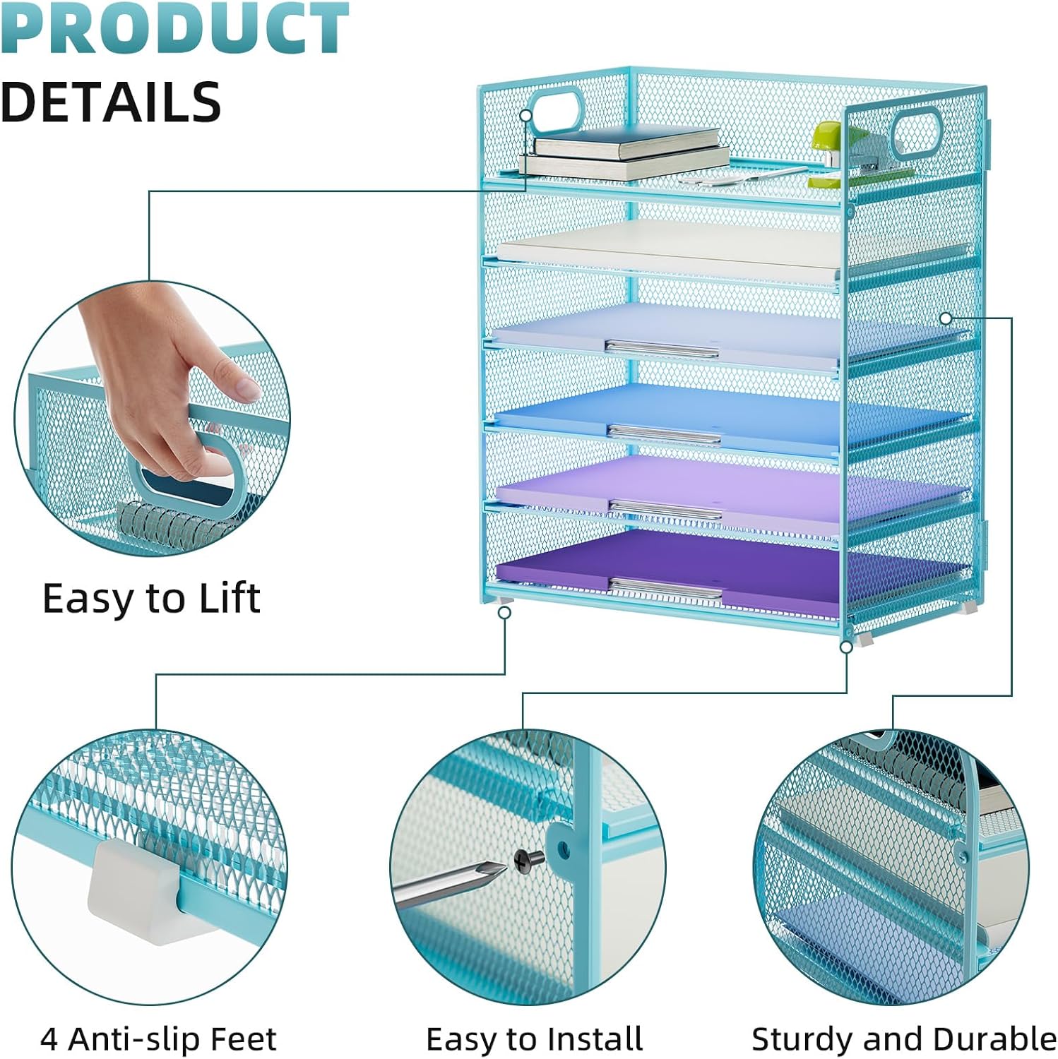 Marbrasse 6 Tier Paper Organizer Letter Tray - Mesh Desk File Organizer with Handle, Paper Sorter for Letter/A4 Office File Folder Holder -Blue