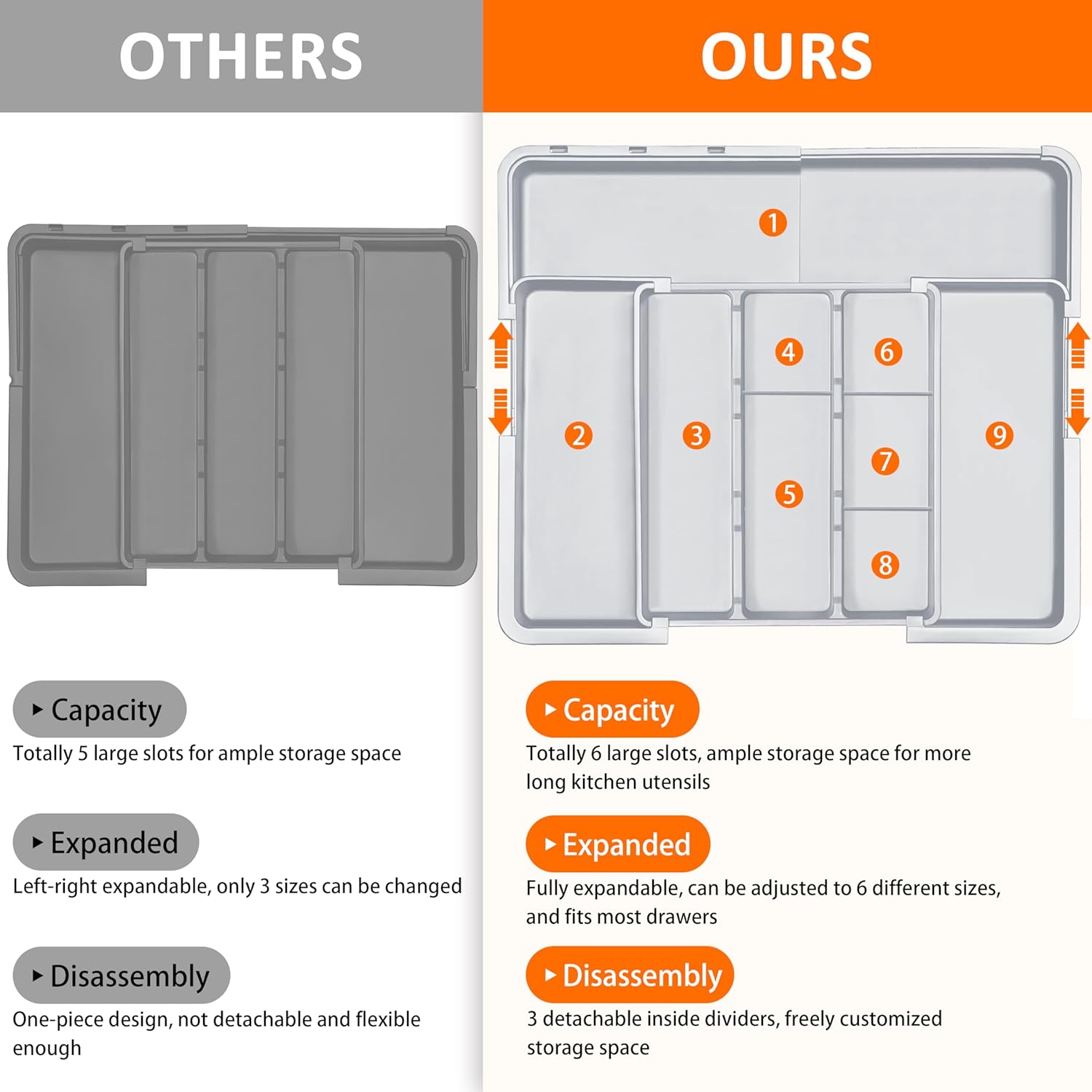 - Super Large Capacity: This silverware tray features 3 compartments in the middle and 3 expandable layers. The expandable compartments are great for storing not just large kitchen cooking utensils such as spatulas, tongs and ladles, but also small flatware and silverware, such as forks, spoons and knives. Maximize the storage capacity of your extra-wide kitchen drawers.