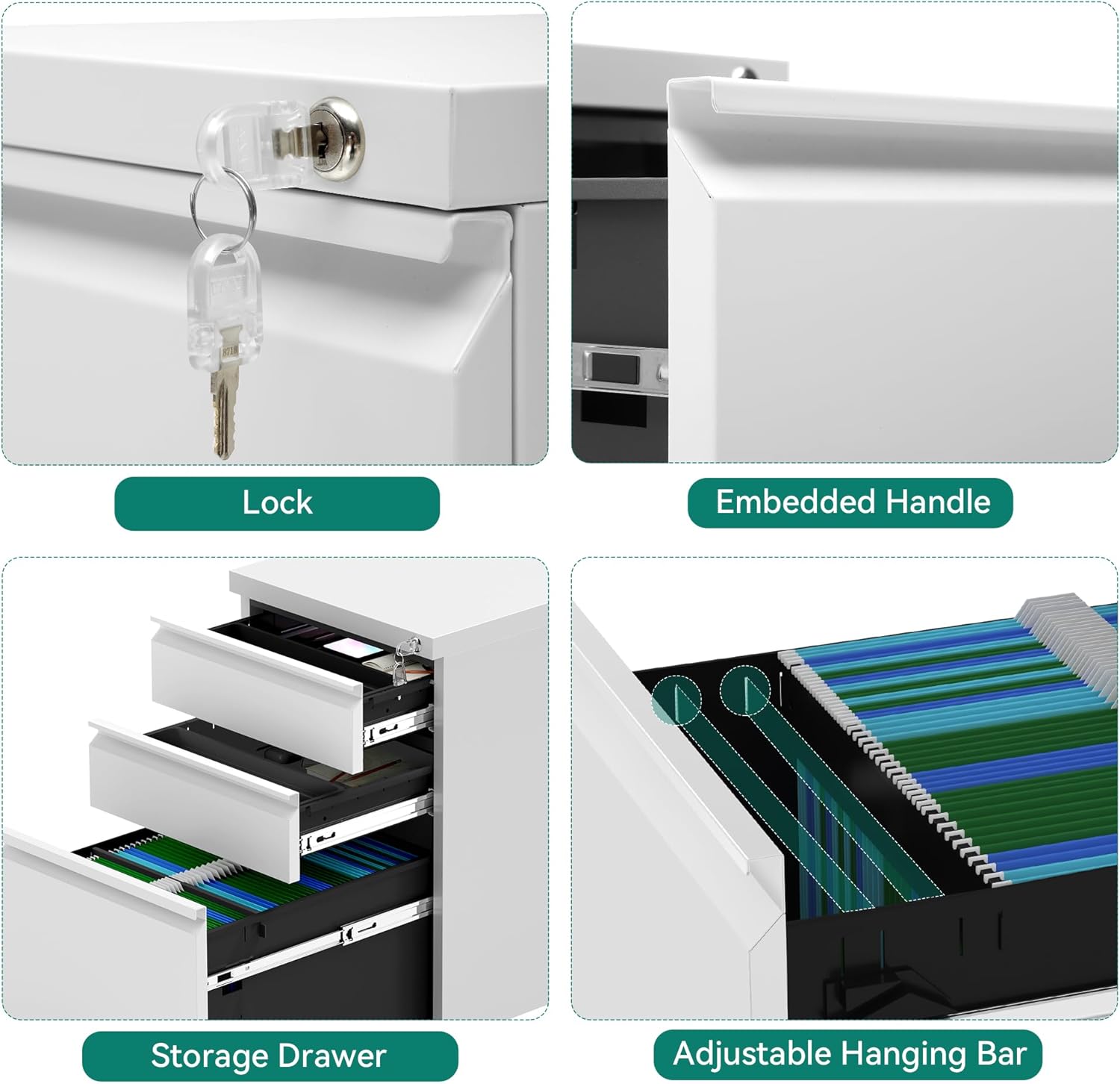 - ă Large storage drawer ă Three drawer file cabinet provide large storage space, each drawer provides movable hanging bar, can allow letter size documents to be hung horizontally and vertically, legal and A4 size documents can only be hung vertically, not horizontally; Please carefully measure the size of your desk and documents before purchasing, so that you can better store and organize your documents.