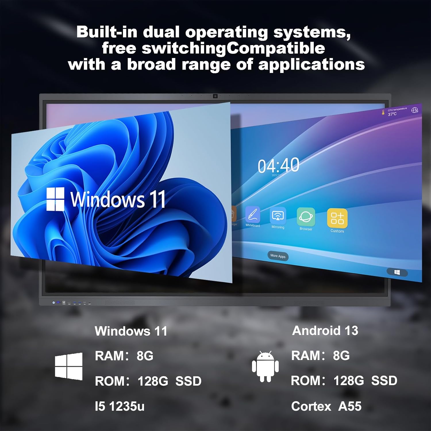 - Dual-system electronic whiteboard: ZPNUZDU smart board is based on Windows11 and Android13 dual operating systems. The new series of Android system adopts Cortex-A55 *4 core CPU 8GRAM+128GROM to run various programs smoothly and efficiently. Windows uses Intel@ Core i5-1235U CPU 8GRAM+128GROM. The high-configuration hardware can provide excellent touch and interactive experience for teaching, training, conference, social interaction, etc.
