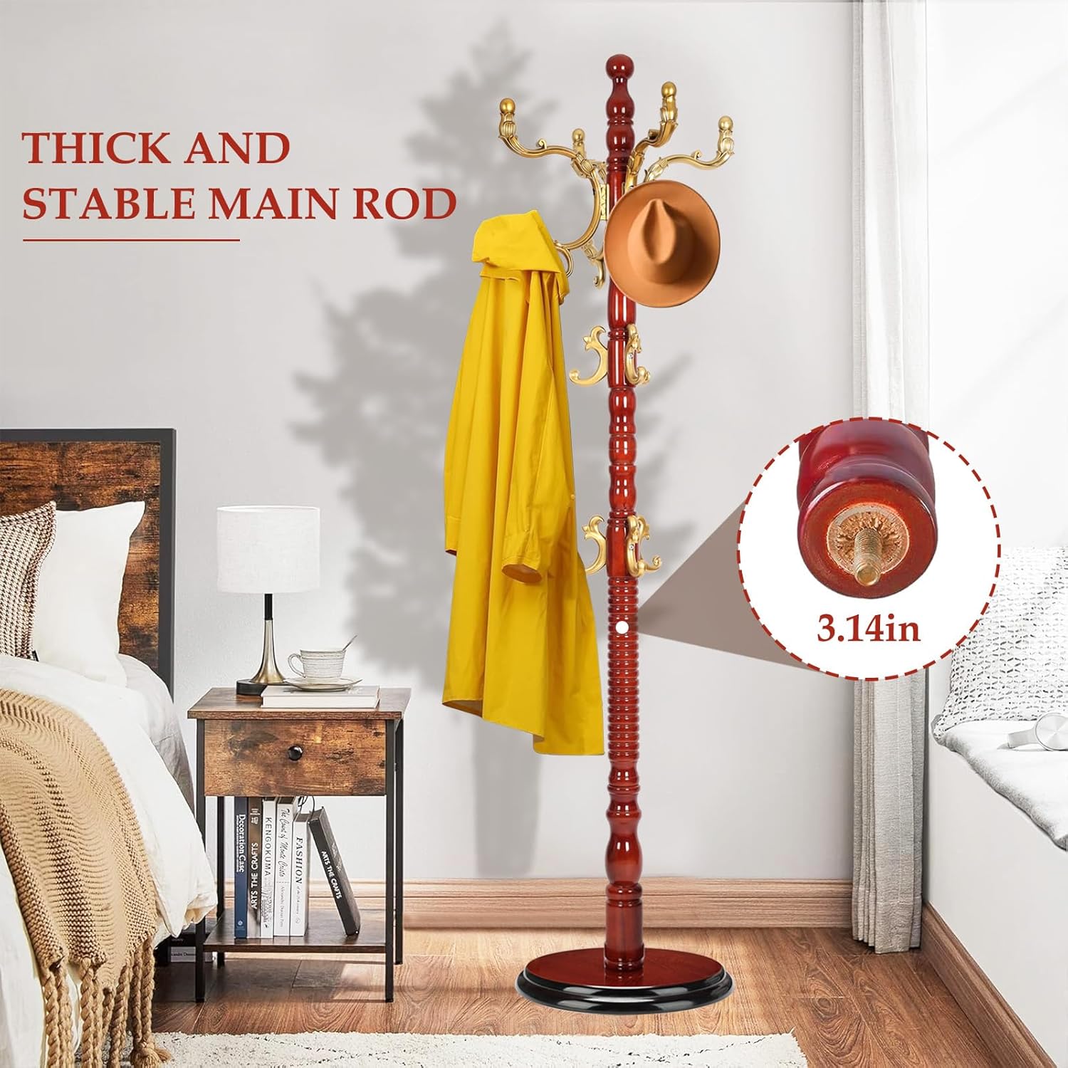 Wood Coat Rack Freestanding, Natural Coats Tree Stand with 14 Hooks, 73" Sturdy and Easy Assembly Coat Rack Stand for Entryway, Hallway, Bedroom, Bags, Hats (Heavy-duty Disc Base, Golden)