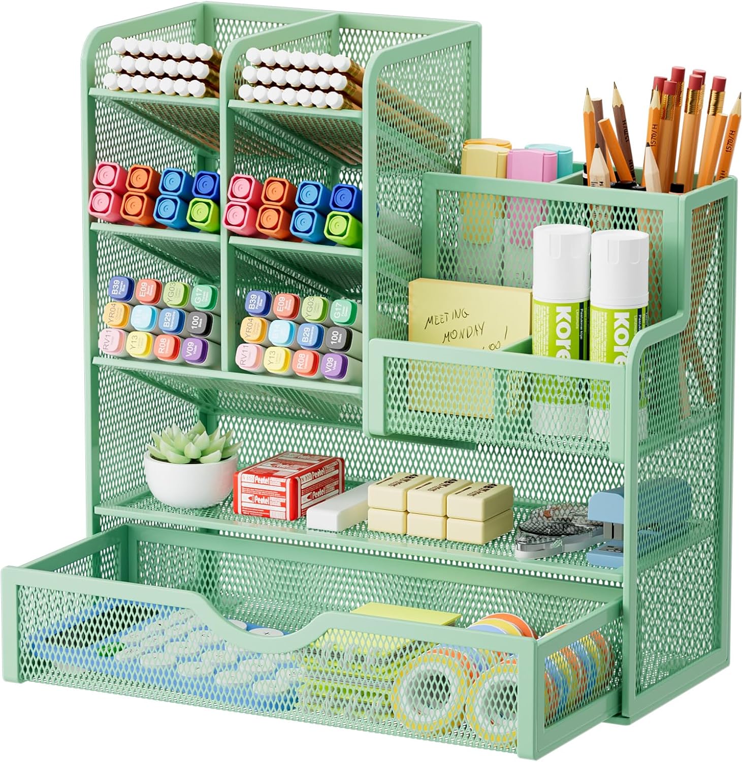 Marbrasse Mesh Pen Holder for Desk, Multi-Functional Pencil Organizer with Drawer, Desk Organizers and Accessories for Office Art Supplies (Green)