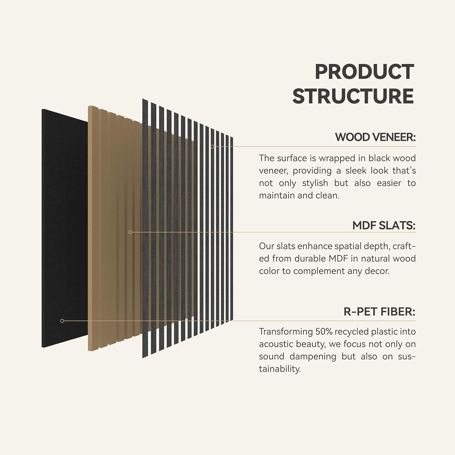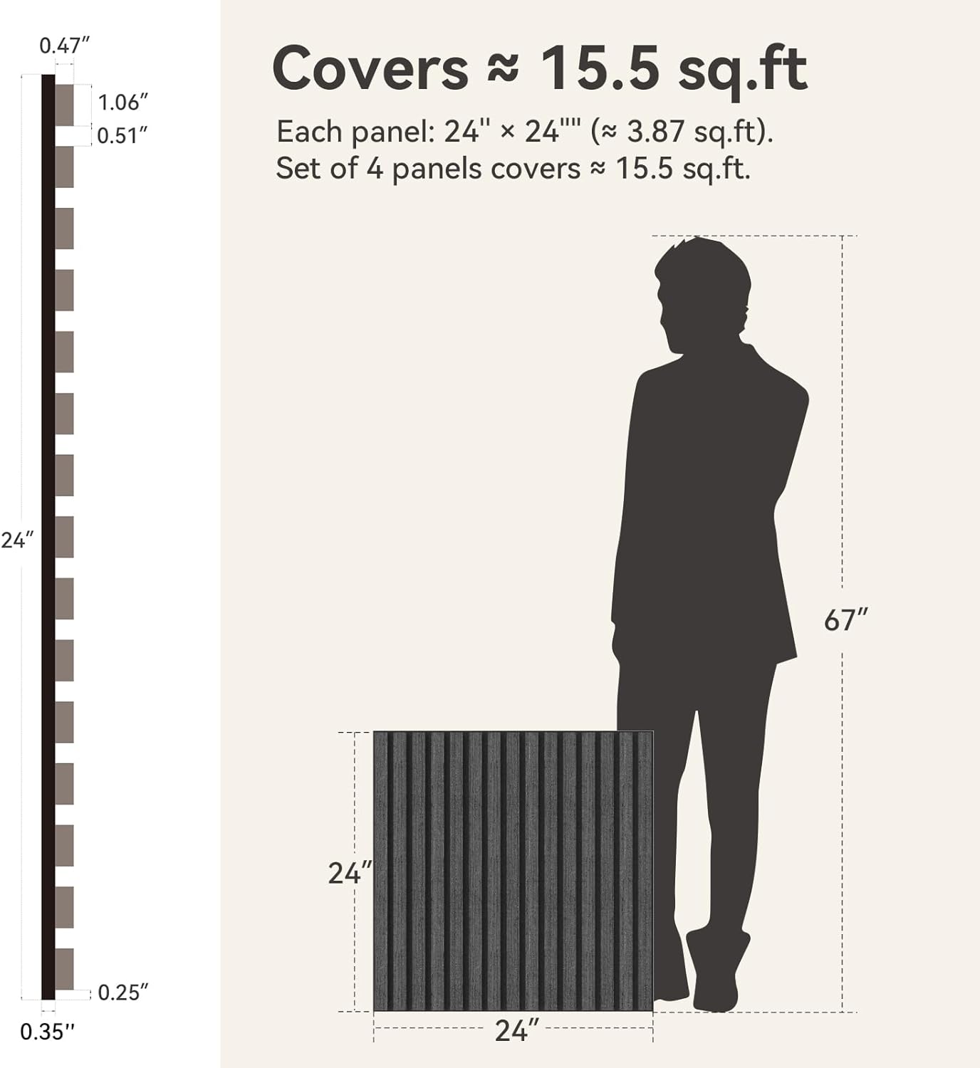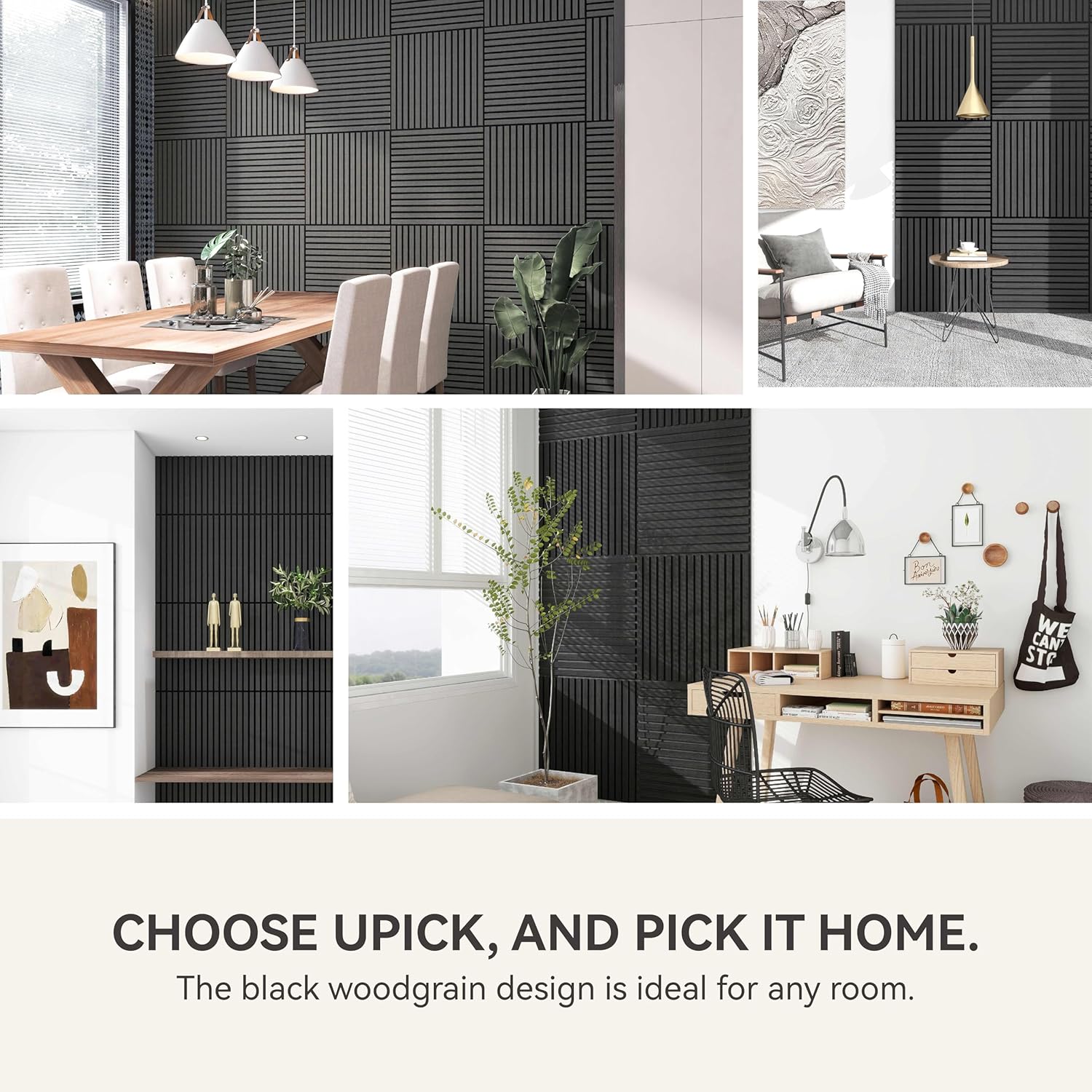 Upick MDF Acoustic Wall Panels Sound Absorbing, 4 Pack 24 x 24 inch Sound Proof Foam Wall Panels & Wood Slat Wall Panels for Interior Wall Decor (Matte Black)