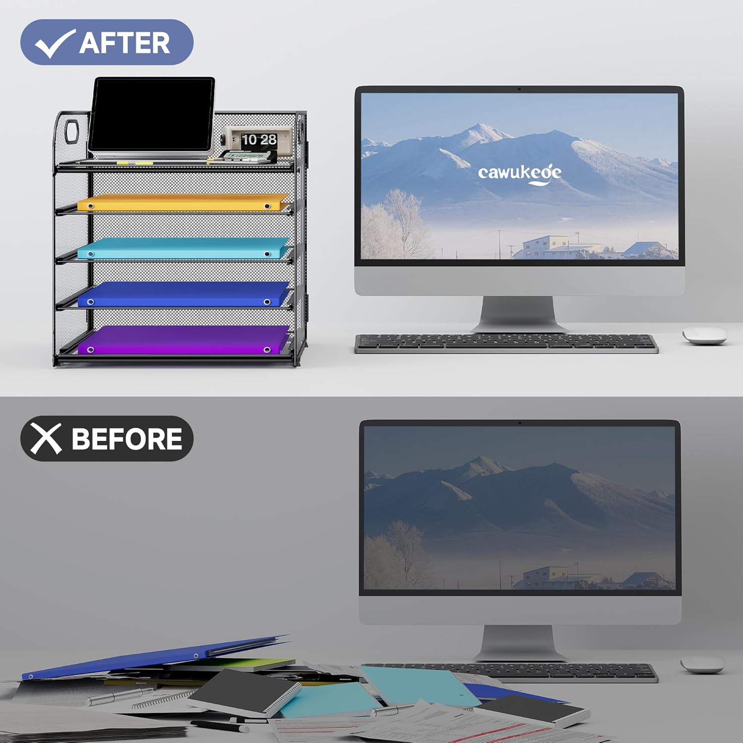 - 【EFFICIENT DESK ORGANIZER】Keep your desk tidy and clutter-free with our 5-Tier Paper Organizer with Handle. This file organizer provides ample space for sorting and storing papers, letters, documents, folders, books, magzines, staplers, caculators and sticky notes.