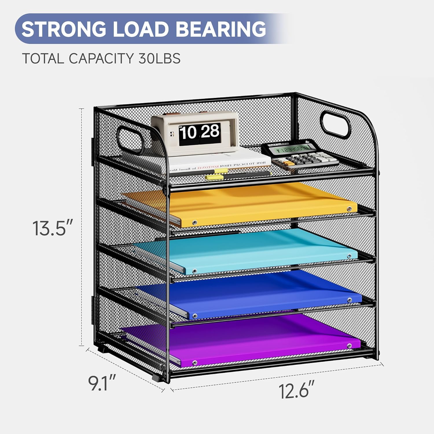 5 Tier Paper Organizer with Handle, Metal Mesh Desk Organizer File Folder Paper Letter Tray Desktop Document Sorter for Classroom, School, Office Accessories Organization and Storage - Black