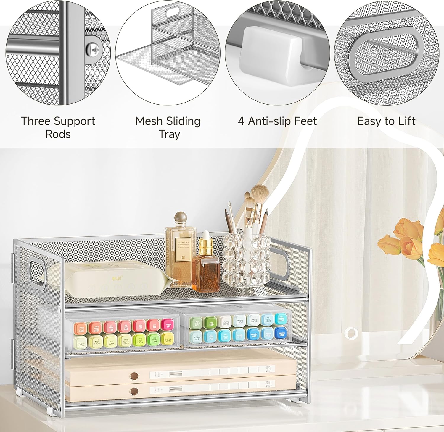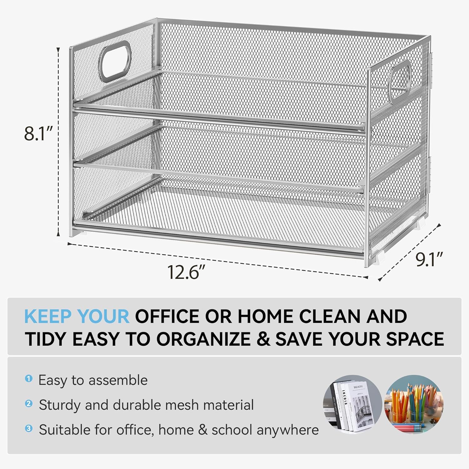 Subekyu 3 Tier Paper Desk Organizer with Handle and 1 PC Slideable Letter Tray, A4 Paper File Folder Sorter Metal Mesh Organizer for Home Office School Desk Supplies Organization Storage, Silver