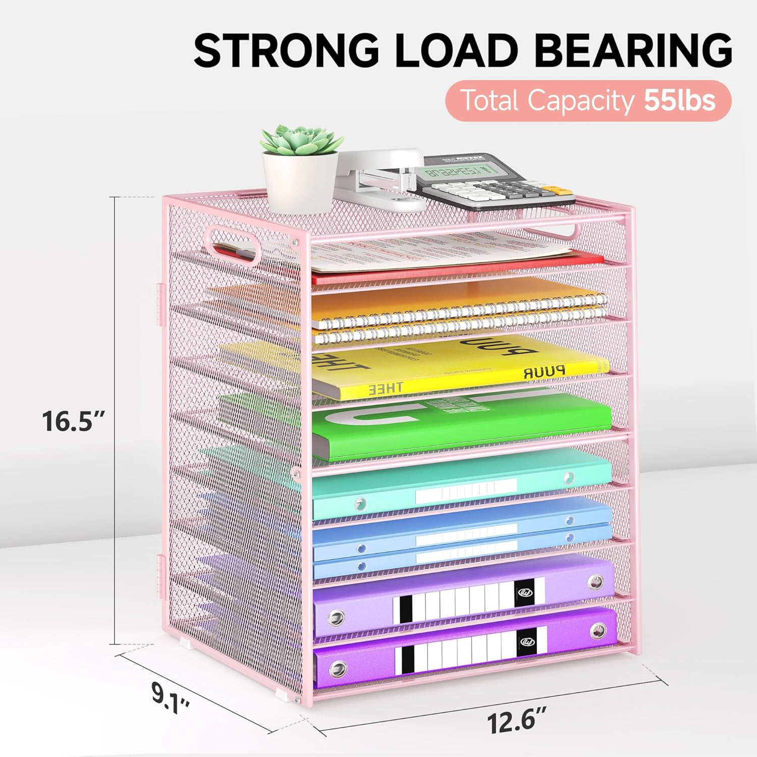 9 Tier Paper Organizer with Handle, Large Capacity Desk Organizer Mesh File Folder Letter Paper Tray Desktop Document Sorter for Classroom, School, and Office Accessories Organization- Pink