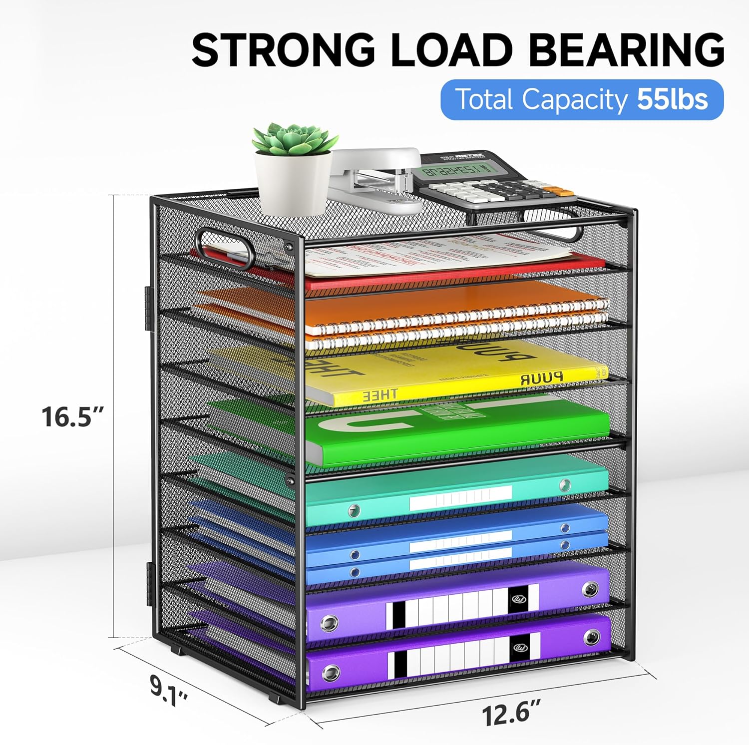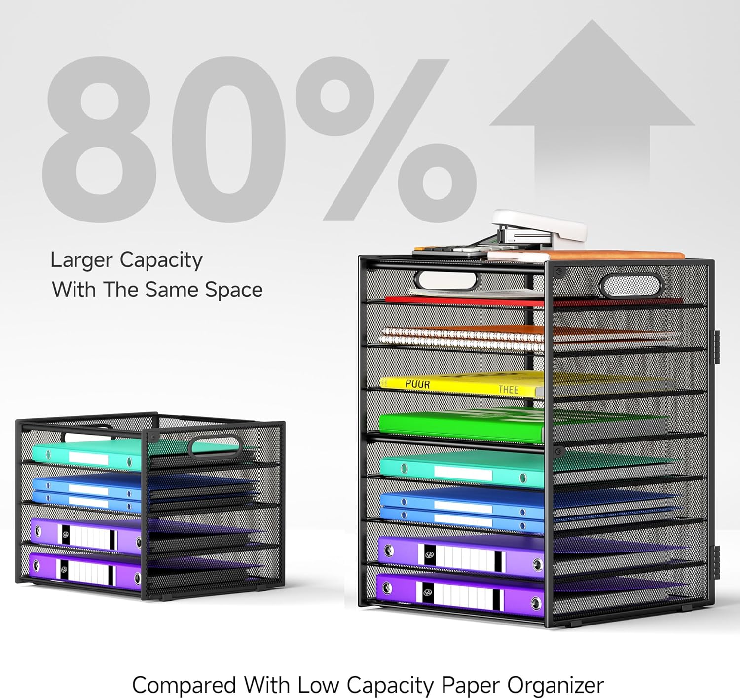 - 【EXTRA-LARGE STORAGE CAPACITY】Our 9-tier paper organizer offers more storage space than low-capacity file organizers, allowing you to sort and store more papers, letters, documents, folders, books, magazines, staplers, calculators, and sticky notes. Keep your workspace tidy and organized!