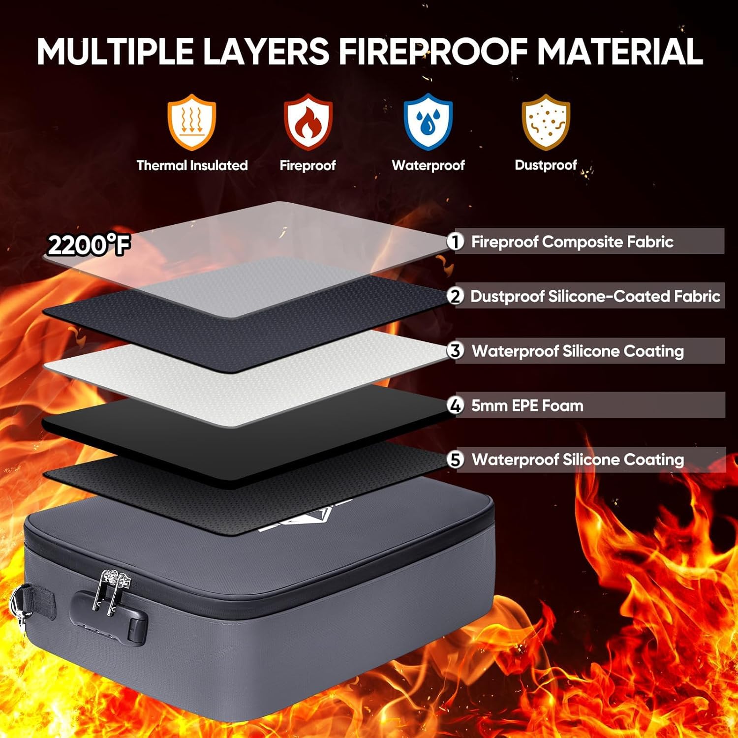 - Fireproof and Waterproof: The fireproof document box /bag is made of dust-proof silicone fiberglass, offering fire resistance up to 2192℉, SGS-certified (UL94 VTM-0); Its waterproof design protects your documents from rain and spills (No folders included)